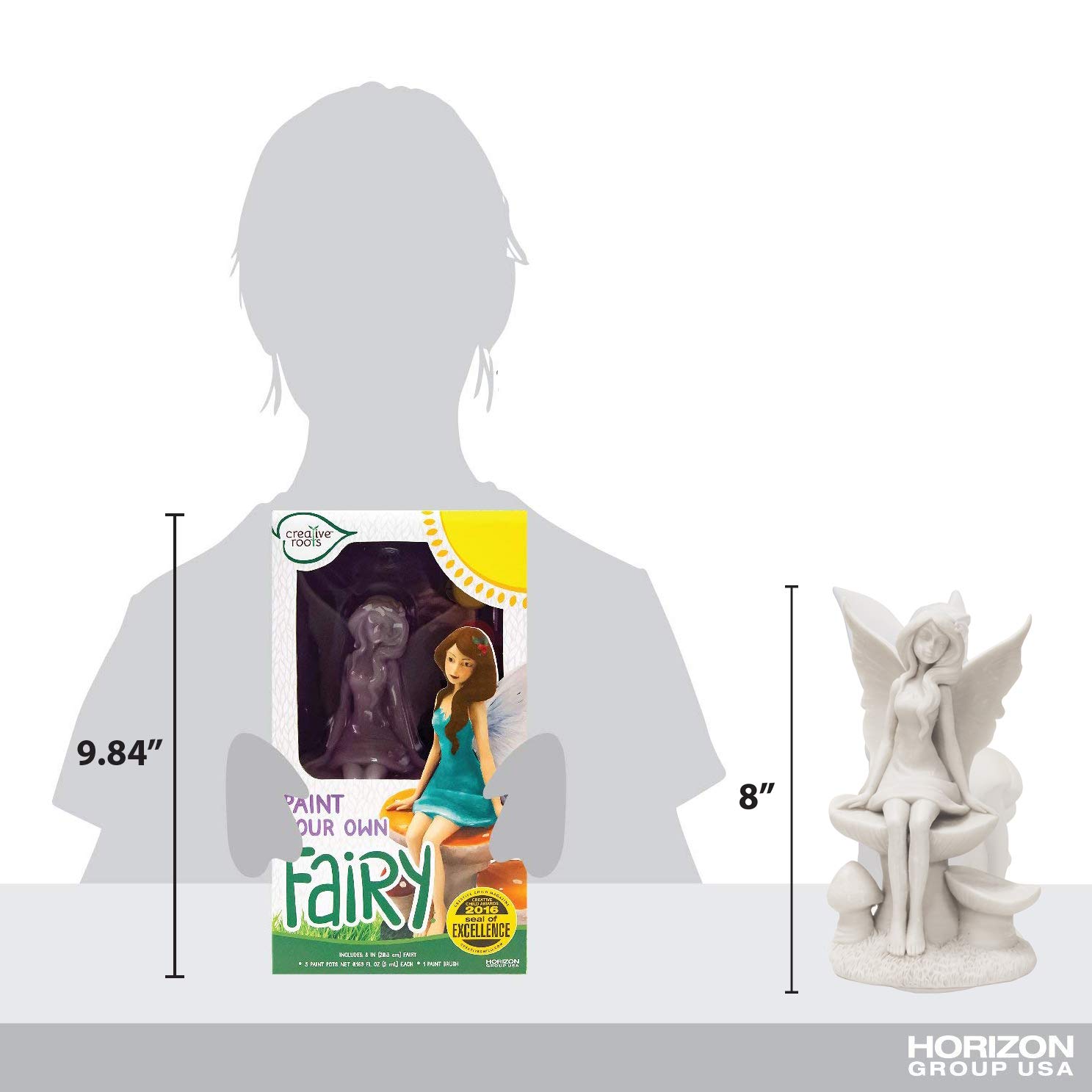 Bring this fairy to life with a pop of color, a dash of magic and a sprinkle of pixie dust! Mix the primary colors to create every color of the rainbow. Proudly display your personalized fairy outside, in a flower pot or on the shelf! To extend the life of your completed fairy, add a layer of exterior varnish for protection. Paint Colors Include: Red, yellow, blue, white and black Kit Includes: 8 in. resin fairy, 5 paint pots, a paintbrush