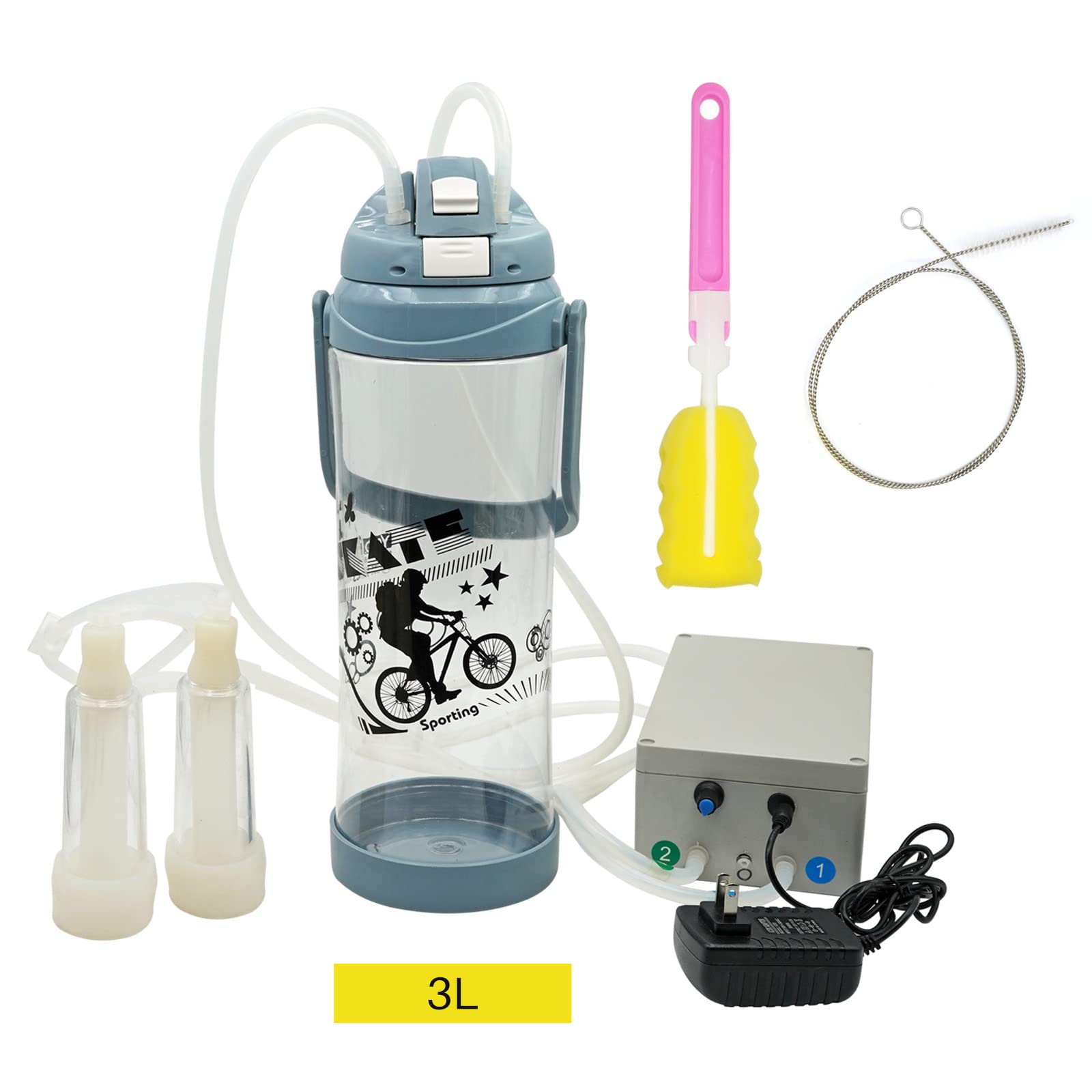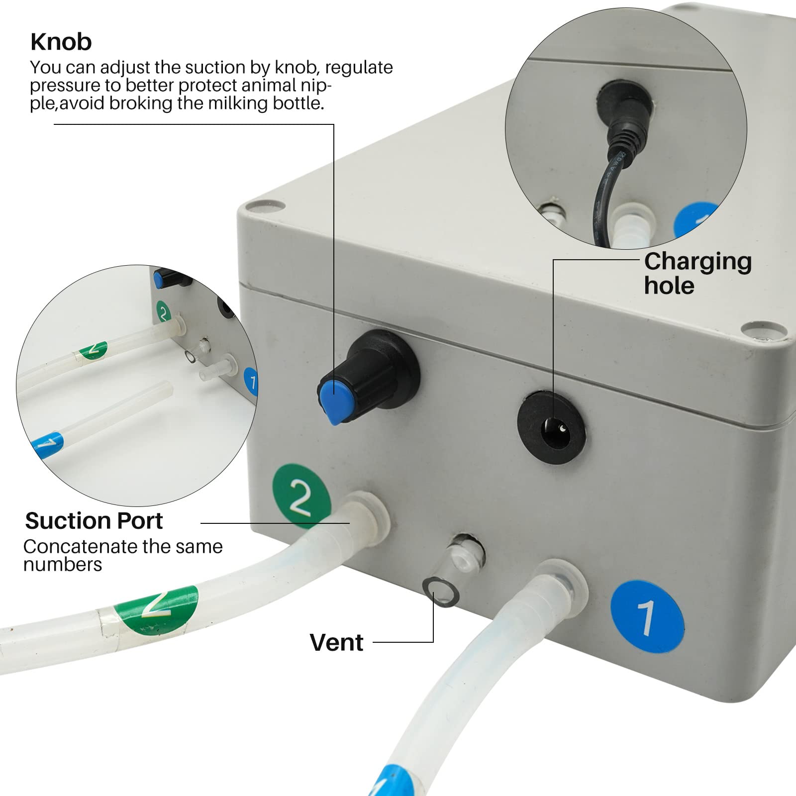 Easy to Use and Clean: This milking machine contains 1x Milker bucket,1x Vacuum pump,1xmilk hose,2x teat cup.There are numbers on the tube connector. You can contect them very easily. With milk hose brush and sponge brush are also included in the package to clean the hose and teat cup more efficiently.