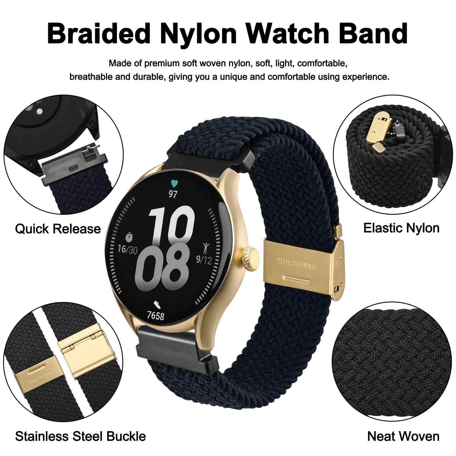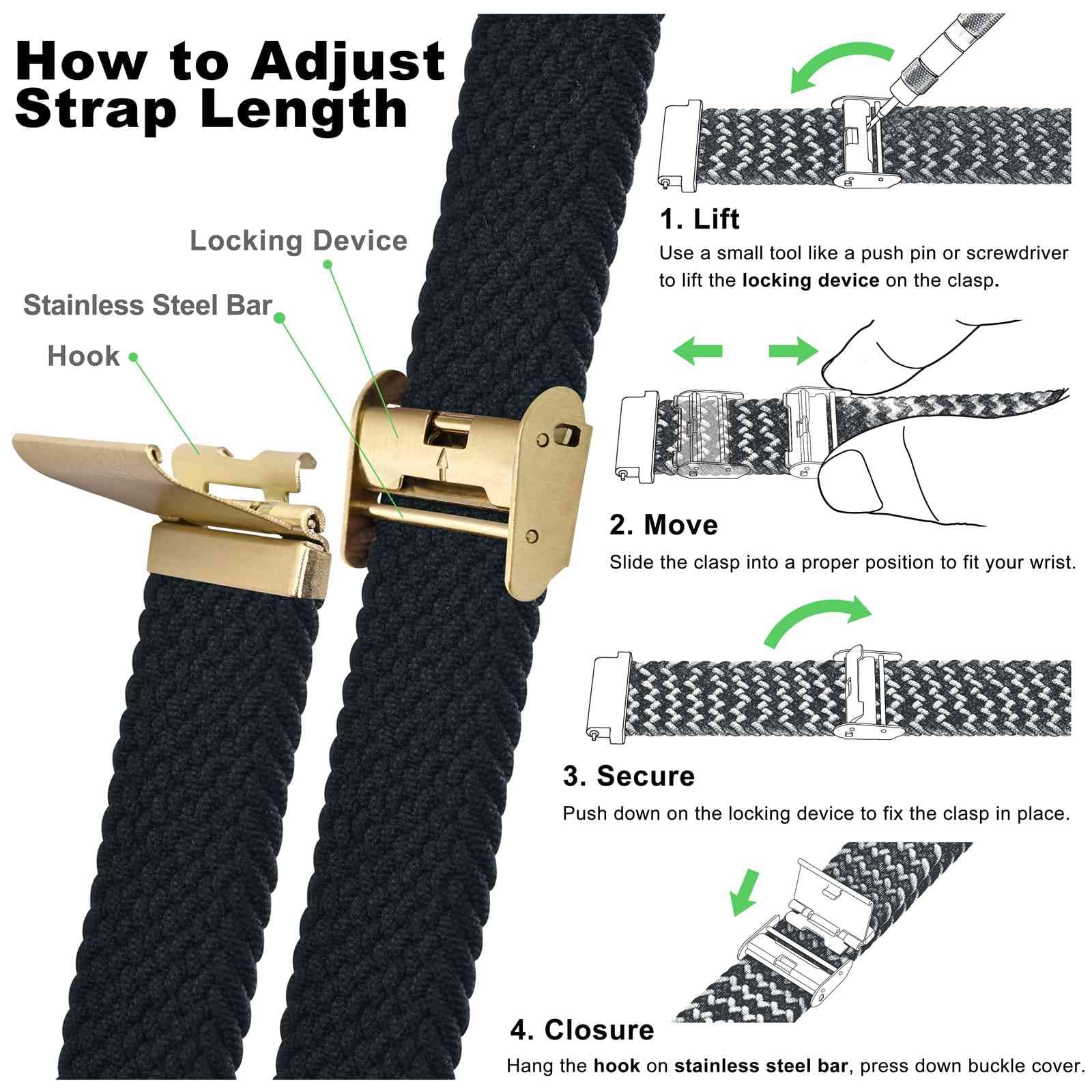 Braided Watch Band: This watch strap is made of quality stretchable yarn interwoven with silicone threads with adjustable buckle, soft, lightweight, breathable, washable, durable and comfortable to wear. Perfect for sports and everyday use.