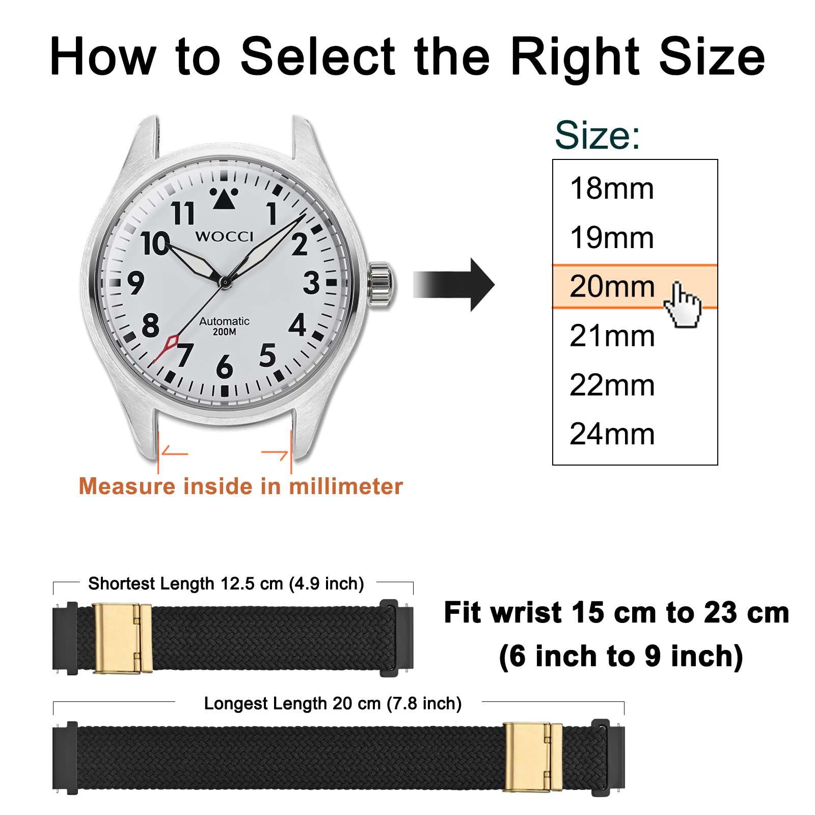 Select Band Width (Size): 16mm 18mm 19mm 20mm 21mm 22mm 24mm. Compatible with most traditional watches and smart watches which lug width is standard 16 18 19 20 21 22 24 millimeters. In order to get a suitable strap, please measure inner distance in millimeter between two horns on your watch.
