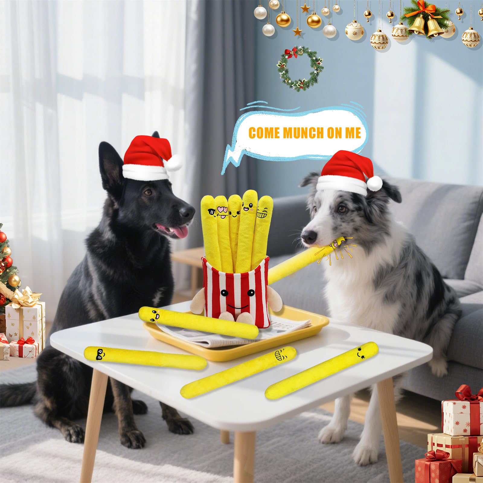 【Holiday Dog Toys】Our christmas dog toy pack set comes in a charming French fries carton, making it a standout gift for pet owners. The packaging is not only eye-catching but also functional—simply store the toys back in the carton when not in use for easy organization. Whether it’s a birthday, holiday, or "just because" gift, this dog toys set is sure to delight both pets and their humans.