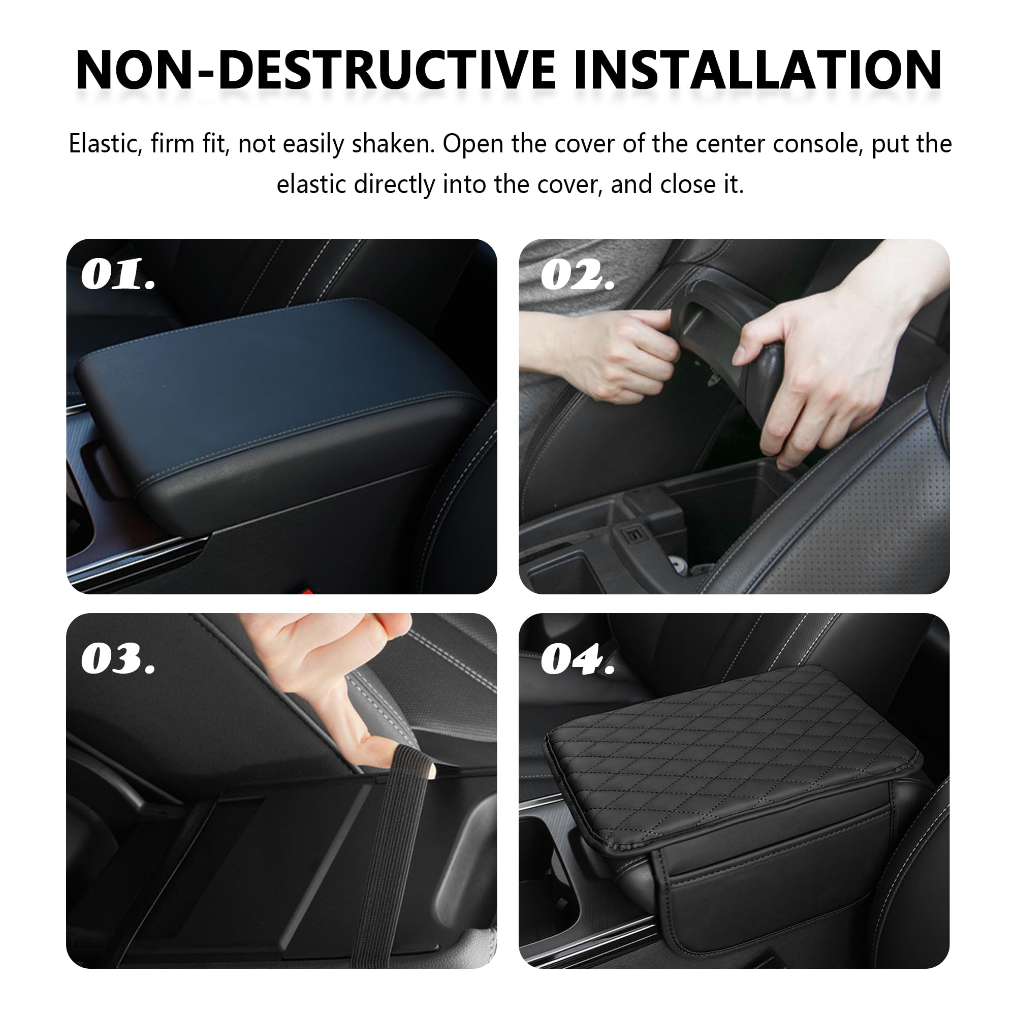 🔰 NON-DESTRUCTIVE INSTALLATION - This car console cover is designed with an elastic band for a firm fit and not easy to shake. And the back side is full of protruding dots, which can effectively avoid the armrest cover from slipping and shifting. All you need to do is to open the center console cover, put the elastic band directly into the cover and then close it.