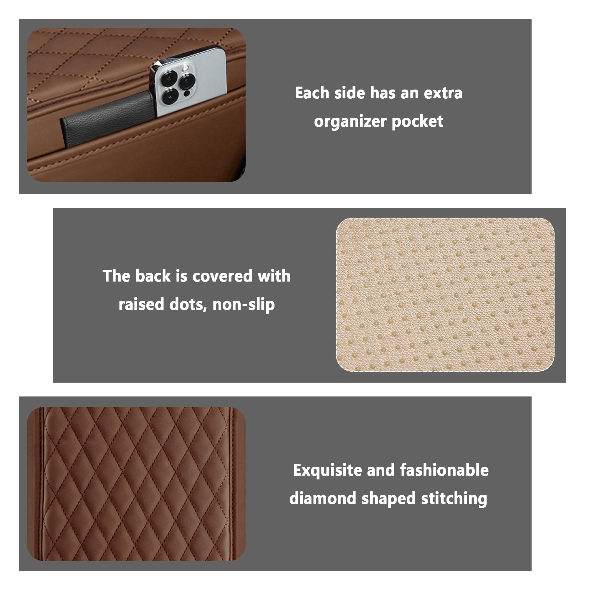 THE UPGRADED CAR CENTER CONSOLE COVER BRINGS YOU A NEW AND MORE COMFORTABLE EXPERIENCE! 🪁 [Do You Struggle with Any of These During Your Daily Driving?] ★ The center console is not protected by a mat and is easily soiled, broken and scratched. ★ Long time driving arm fatigue and soreness. ★ There is no place to store small daily items. ★ Our car armrest cover can easily solve these problems and protect your car's center console in all aspects. 🪁 [Product Informations] ★ Size: 12.13*7.80*0.79 inch ★ Material: Microfiber Leather ★ Color: Black, Gray, Red, Brown, Beige ★ Packaging: 1* Car Armrest Cover 🪁 [Product Features] ★ Newly upgraded with an additional organizer pocket on each side. ★ Made of quality microfiber leather, soft and skin-friendly. ★ Adopt ergonomic design to relieve driving fatigue. ★ Protect the car center console from getting dirty or scratched.
