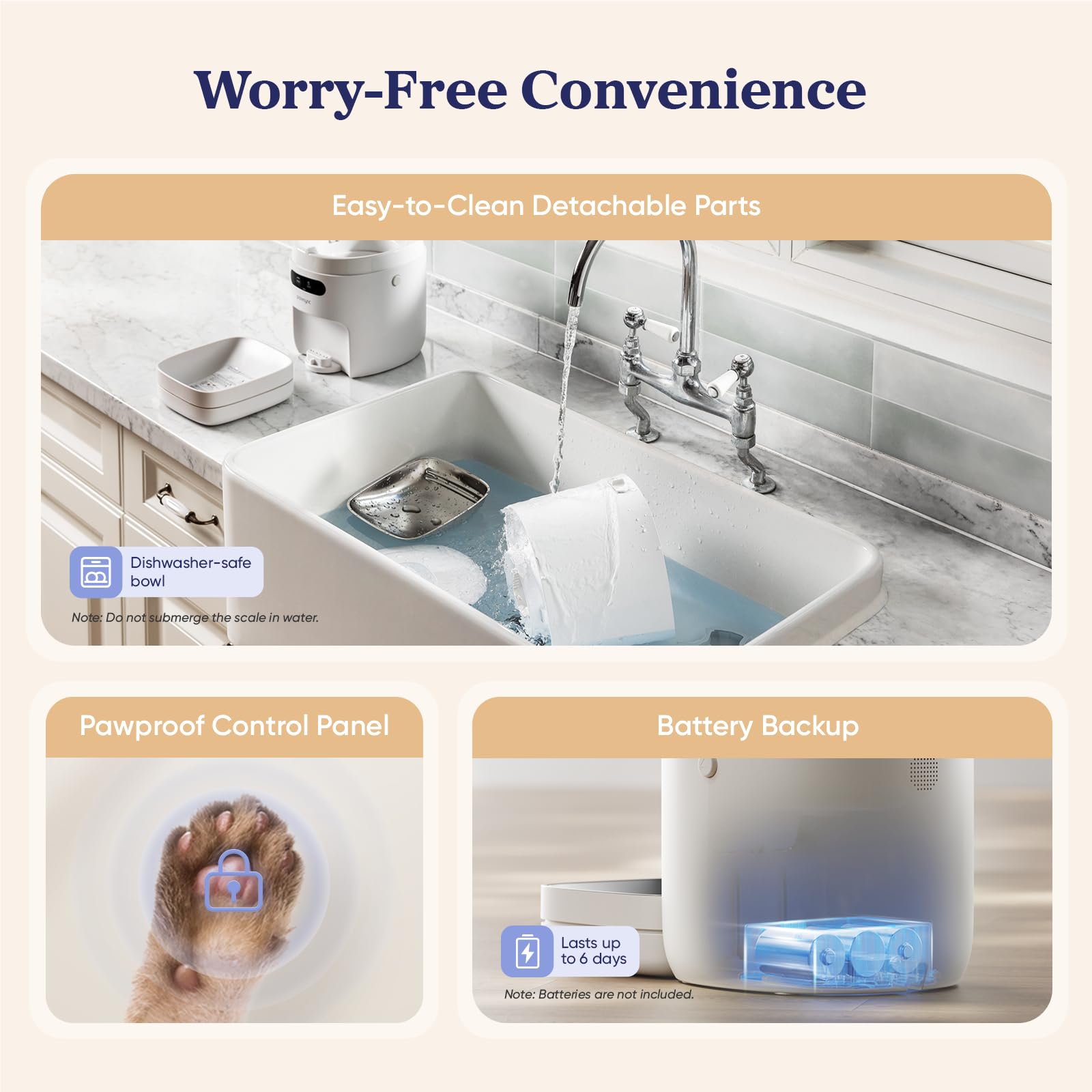 𝐊𝐍𝐎𝐖 𝐇𝐎𝐖 𝐌𝐔𝐂𝐇 𝐘𝐎𝐔𝐑 𝐏𝐄𝐓 𝐄𝐀𝐓𝐒 – Smart Scale Tracks Every Bite: The feeder's built-in scale tracks your pet's eating habits with real-time data syncing to the app, accurate to the ounce/gram. Get instant notifications on feeding times, amounts, and speed, along with weekly analyses and feeding trend reports to spot any unusual behaviors early