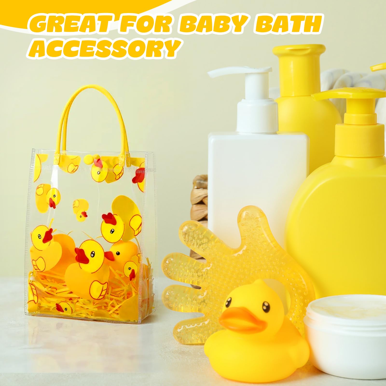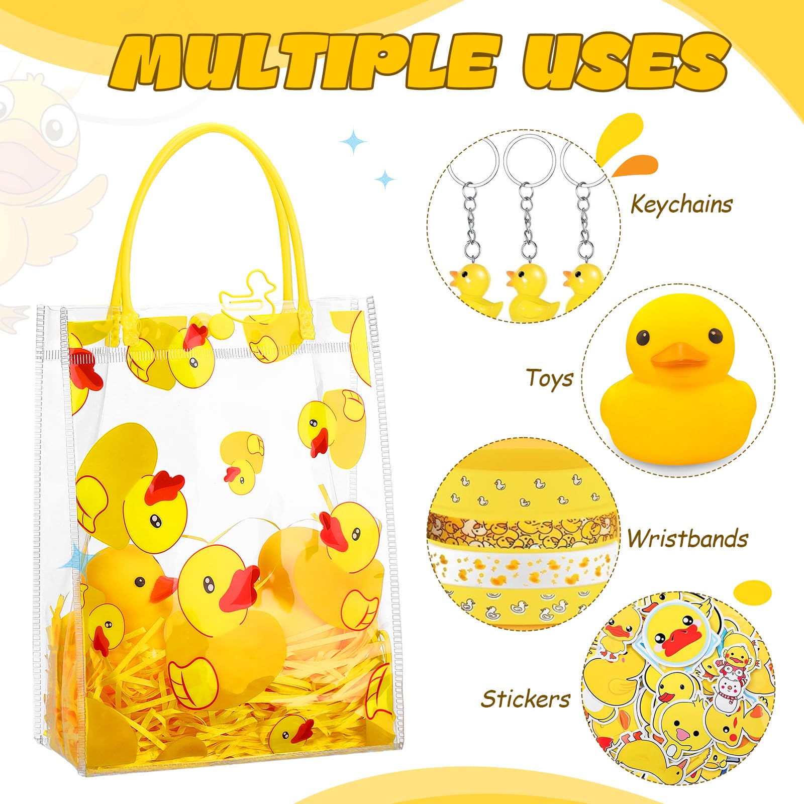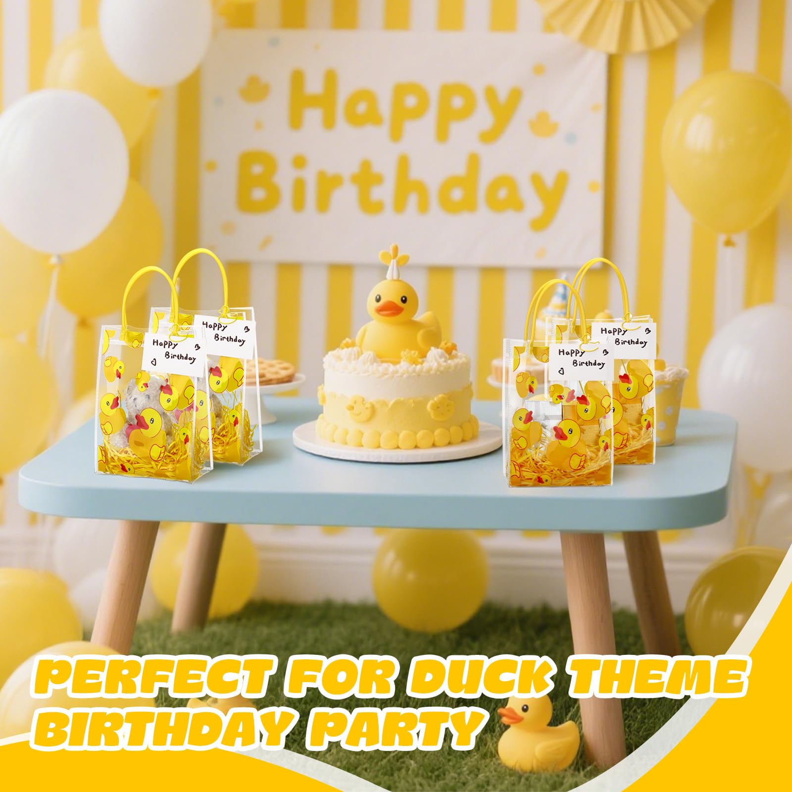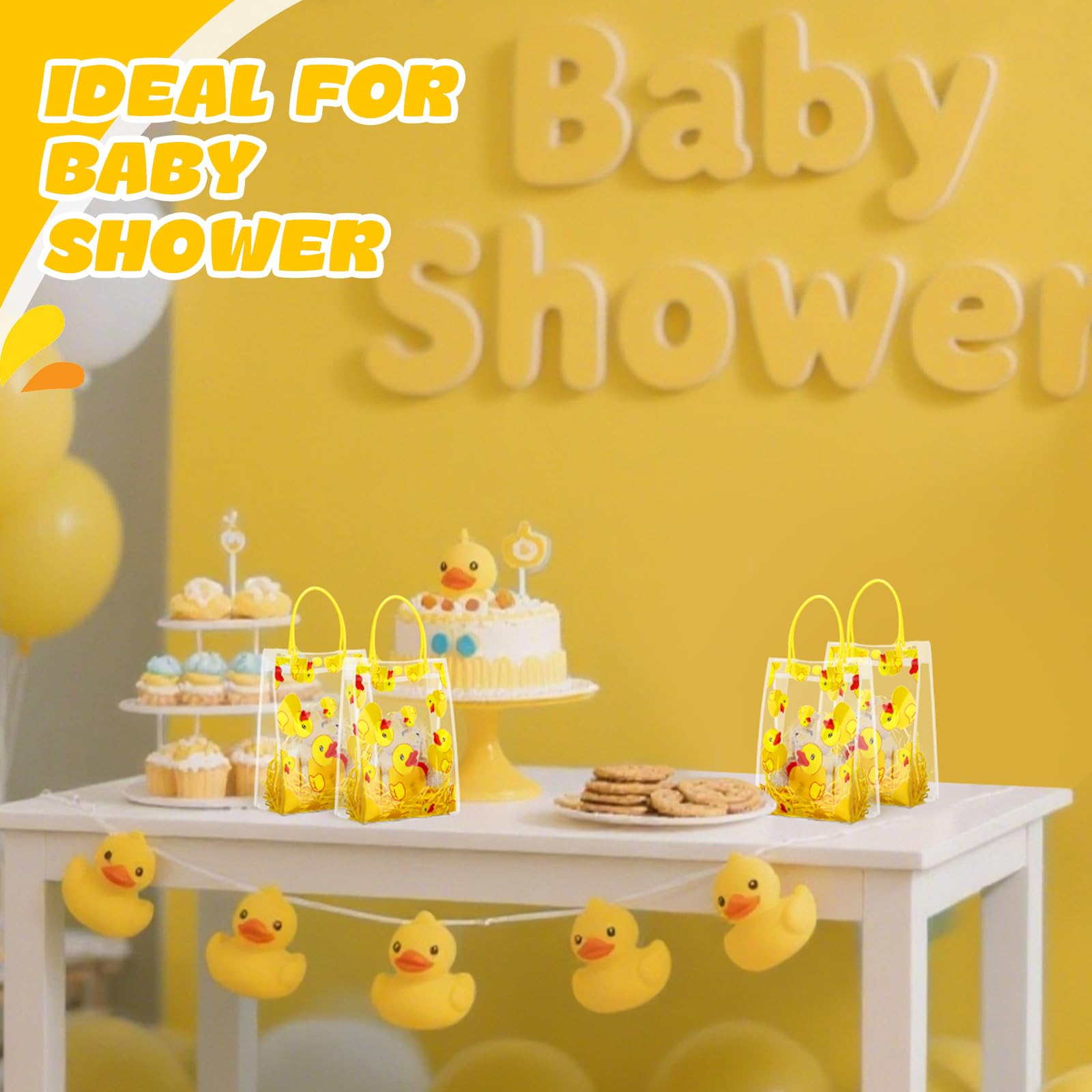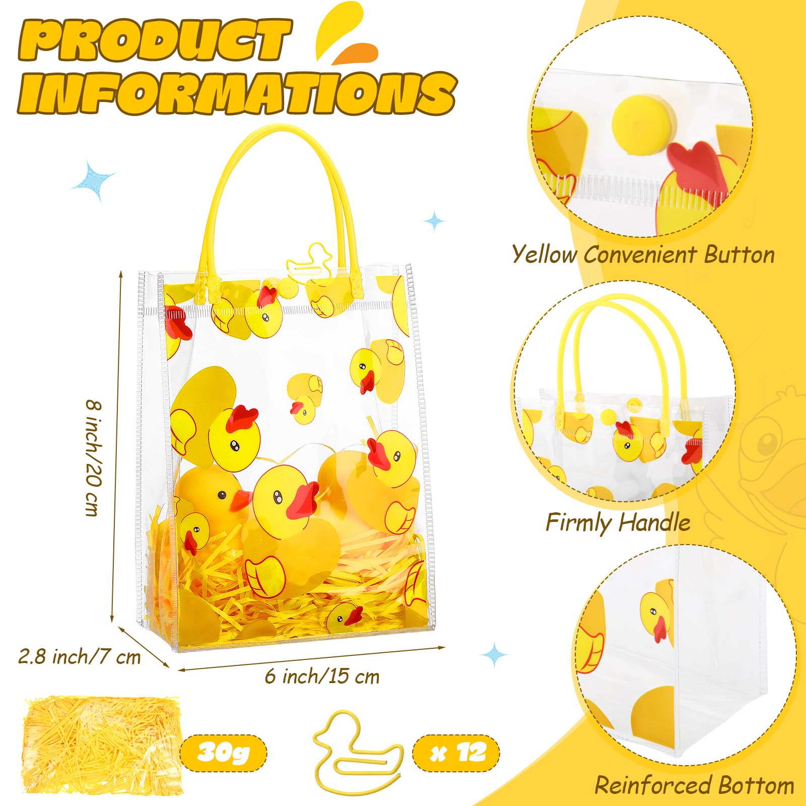 Reliable Material: the yellow duck theme bag is made of transparent PVC plastic, lightweight, designed with portable and strong handles, easy to carry around when you are going out; The matching raffia is bright in color and soft in texture, which can be applied as packaging filler to add a lively atmosphere