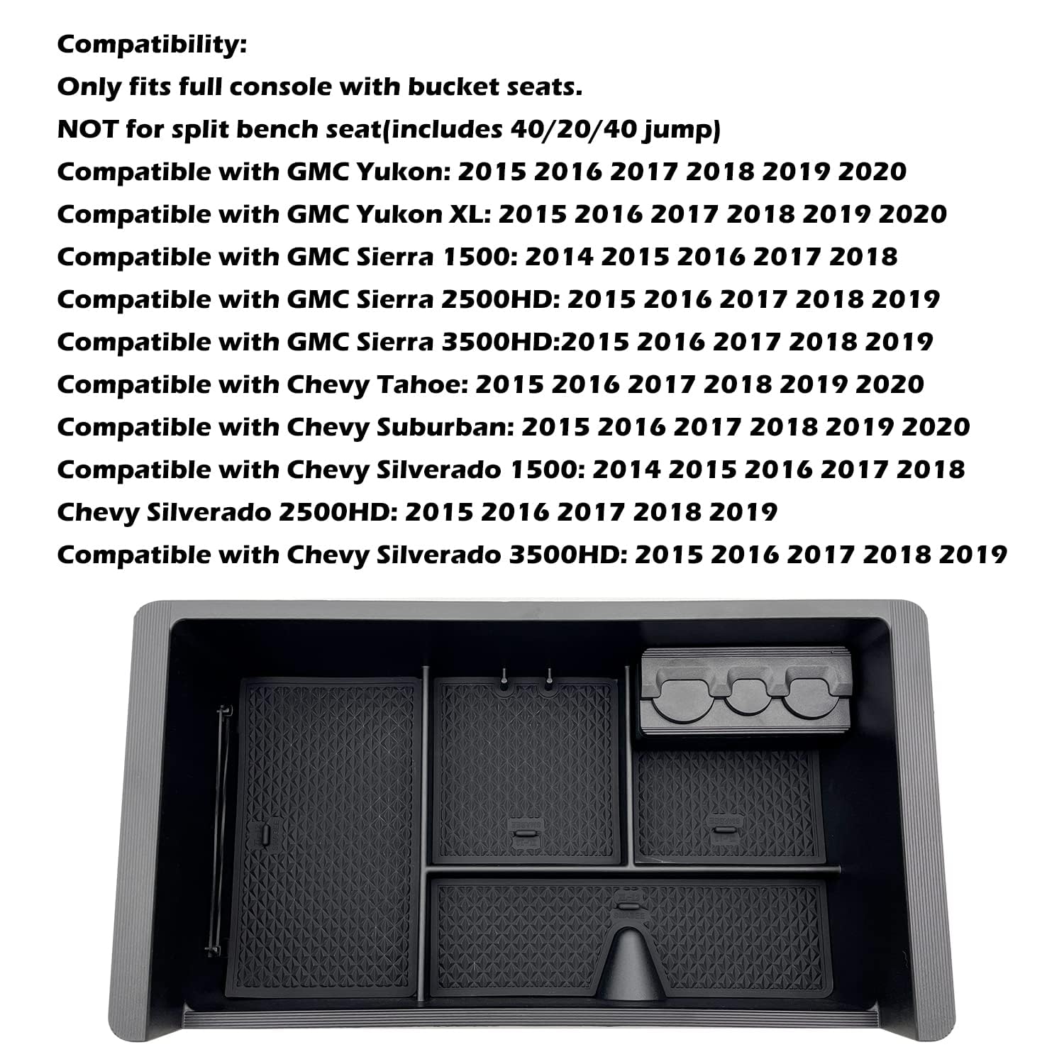 【FITMENT】Center console insert tray fits for GMC Yukon: 2015-2020 GMC Yukon XL: 2015-2020 GMC Sierra 1500: 2014-2018 GMC Sierra 2500HD: 2015-2019 GMC Sierra 3500HD:2015-2019 Chevy/ Tahoe: 2015-2020 Chevy Suburban: 2015-2020 Chevy Silverado 1500: 2014-2018 Chevy Silverado 2500HD: 2015-2019 Chevy Silverado 3500HD: 2015-2019