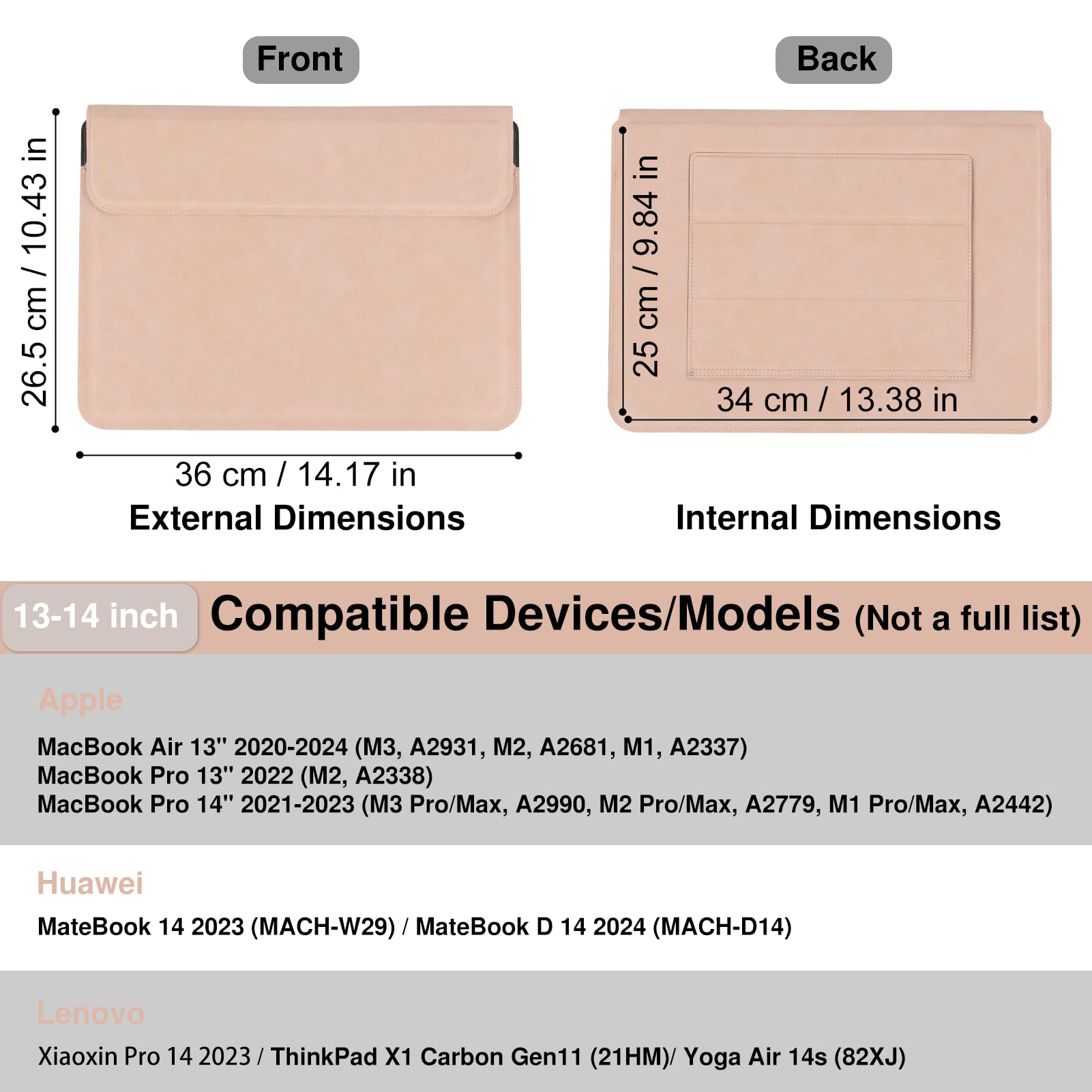 Dimension: External dimensions: 14.17 x 10.43 inches. Internal dimensions: 13.38 x 9.84 inches. Compatible Models: MacBook Pro 14" 2021-2024 (M1 M2 M3 M4 Pro/Max A2442, A2779, M3 A2918, A2992, M4 A3112, A3401, M4 Max A3185)/MacBook Air 13" 2010-2017 (A1466 A1369)/MacBook Pro 13" 2010-2015 (A1502 A1425 A1278). Also compatible with other brands of laptops