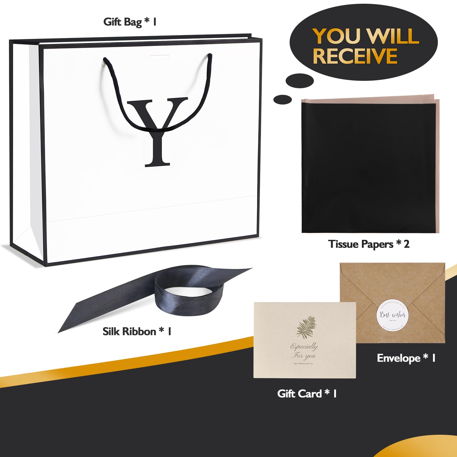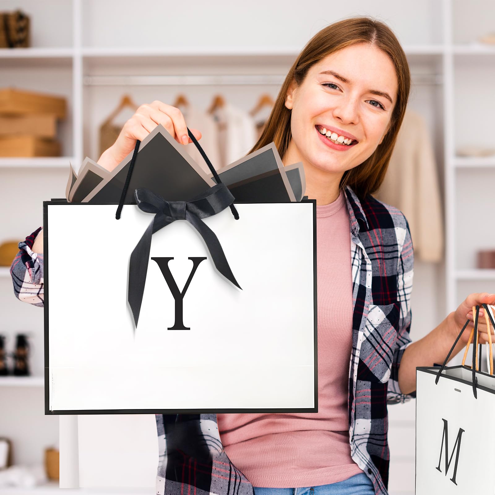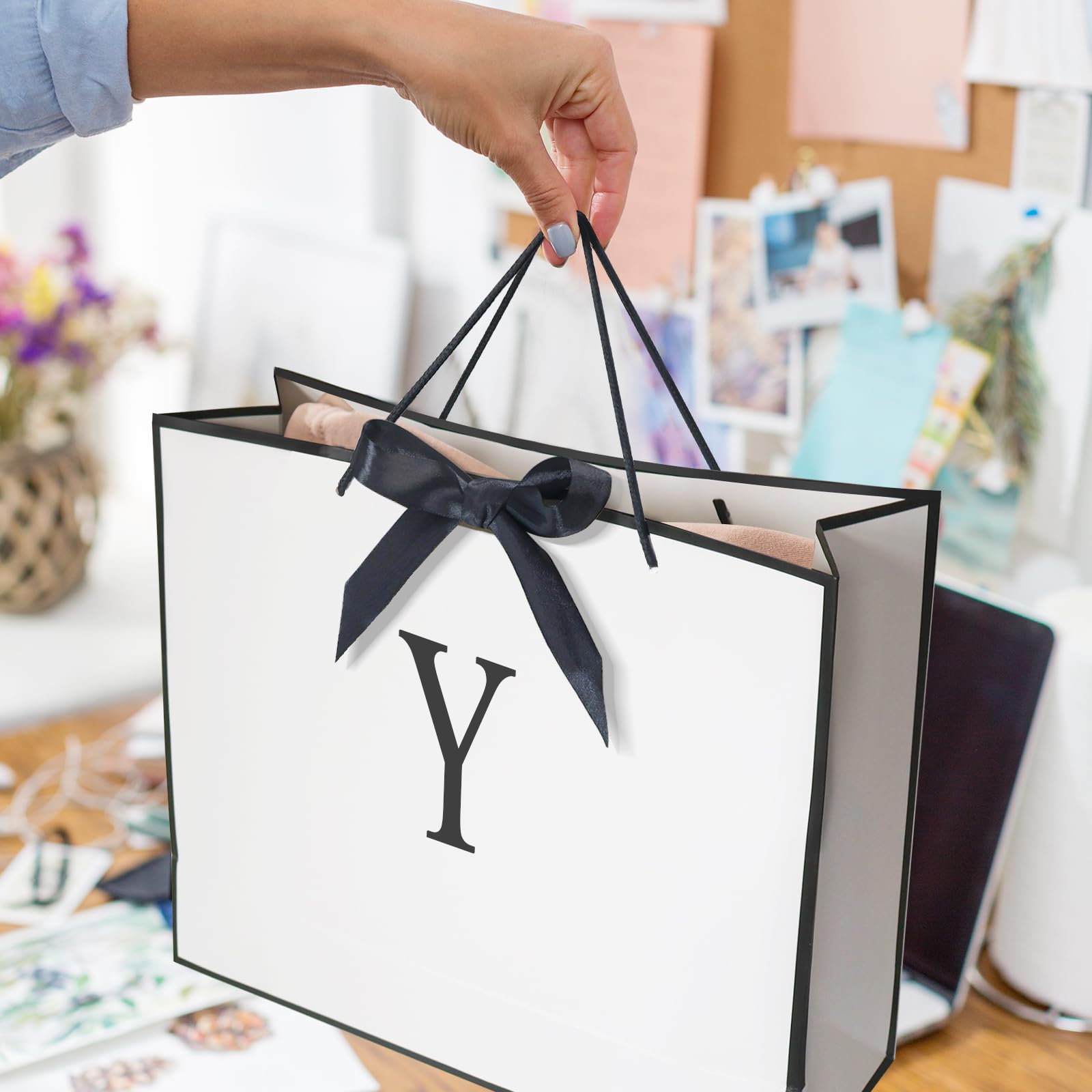 Monogrammed Gift Wrap Bag Personalized Initial Paper Bag with Card Matching Envelope Sticker,Bow Ribbon and Wrapping Tissue Birthday Gifts for Women Men