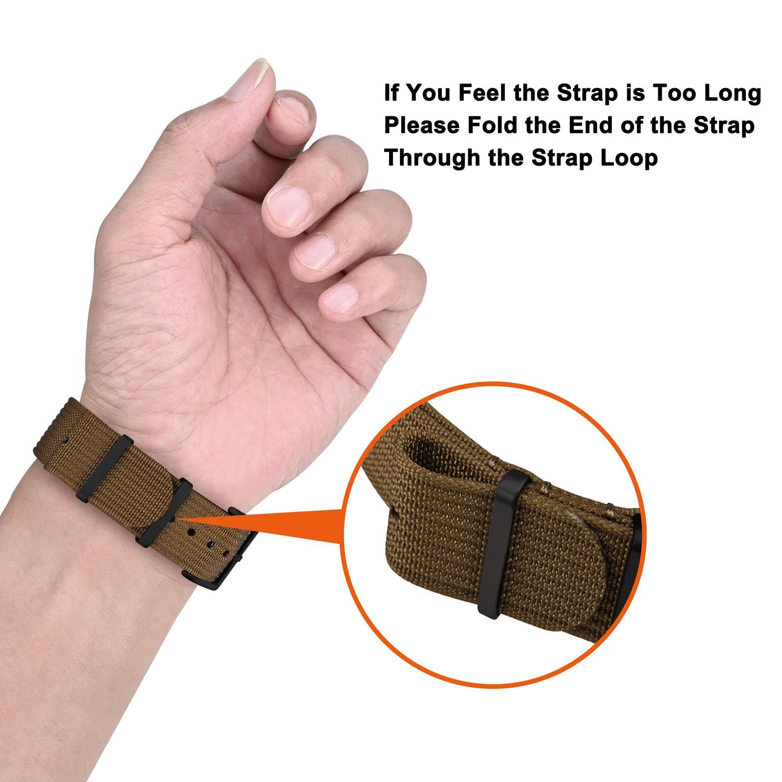 One-piece straps are extra-long by design, total length: 290mm(11.4inches), with 13 holes that fit wrists from 6.1” to 9” in circumference, if the band is longer than desired, the free end can be folded neatly back into the loop