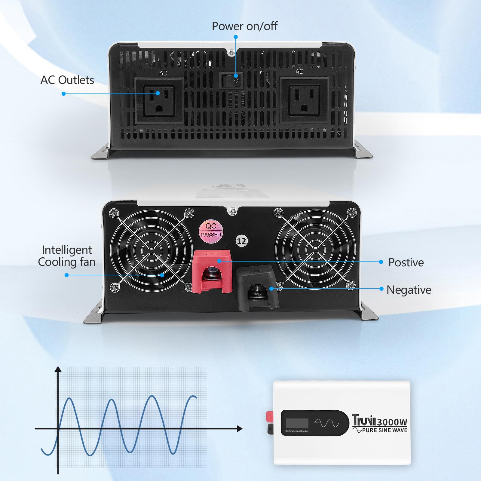 【Conversion Efficiency >93%】 Truvill inverter 12V to 110V provides real 3000W continuous DC to AC power with 2 AC ports, which can up to 6000W peak surge. Stable pure sine wave with conversion efficiency >93%, reduces conversion loss and the interference, better than most other products