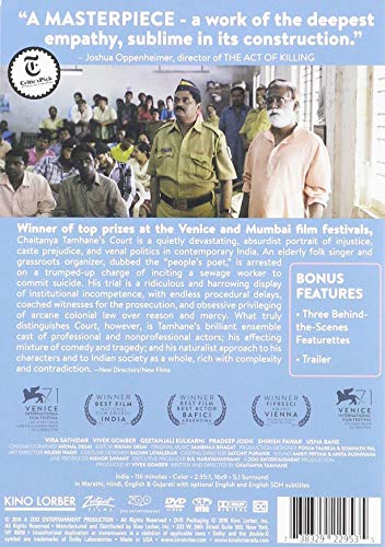 Winner of top prizes at the Venice and Mumbai film festivals, Chaitanya Tamhane s Court is a quietly devastating, absurdist portrait of injustice, caste prejudice, and venal politics in contemporary India. An elderly folk singer and grassroots organizer, dubbed the people s poet, is arrested on a trumped-up charge of inciting a sewage worker to commit suicide. His trial is a ridiculous and harrowing display of institutional incompetence, with endless procedural delays, coached witnesses for the prosecution, and obsessive privileging of arcane colonial law over reason and mercy. What truly distinguishes Court, however, is Tamhane s brilliant ensemble cast of professional and nonprofessional actors; his affecting mixture of comedy and tragedy; and his naturalist approach to his characters and to Indian society as a whole, rich with complexity and contradiction. New Directors/New Films Special Features: Three Behind- the-Scenes Featurettes | Trailer