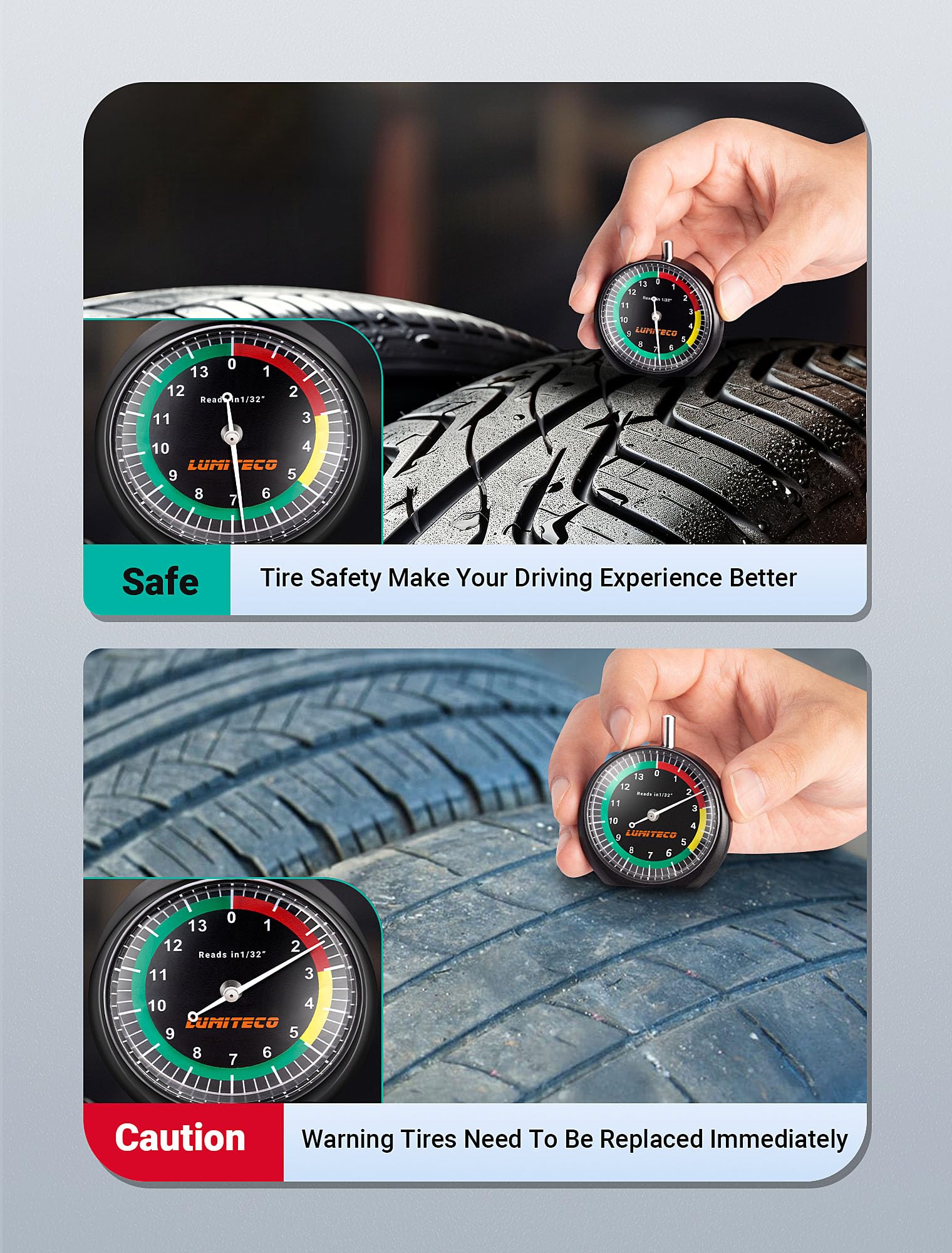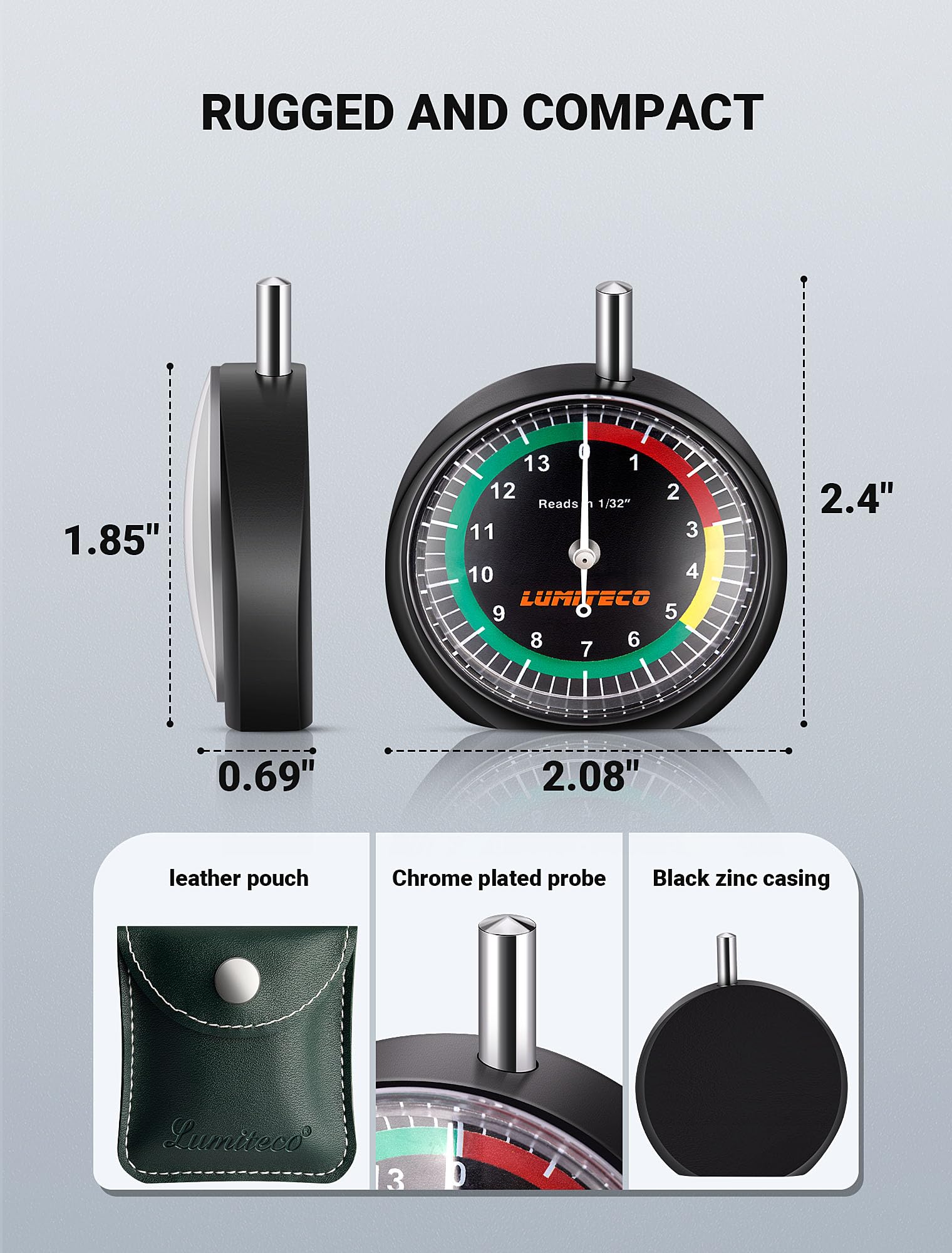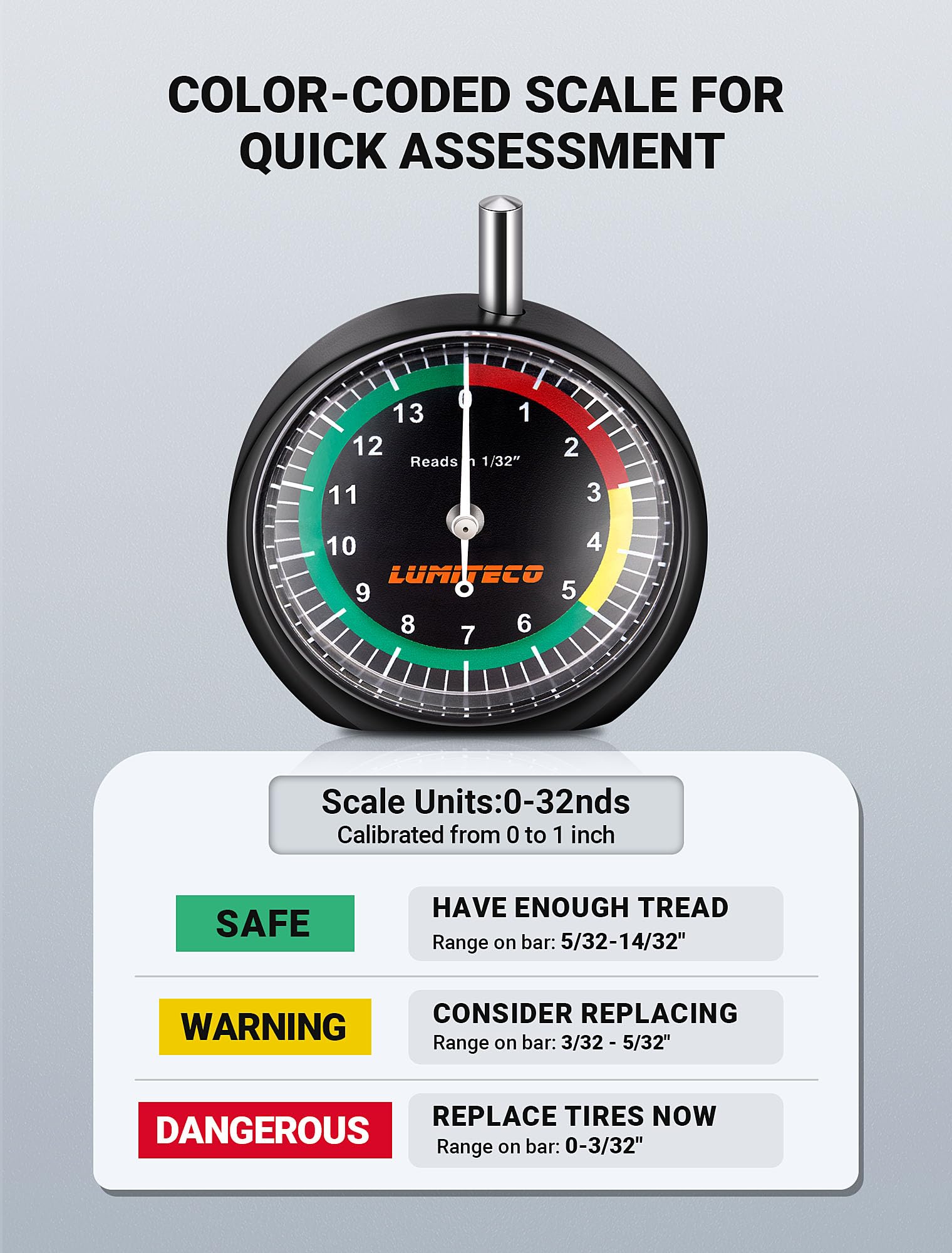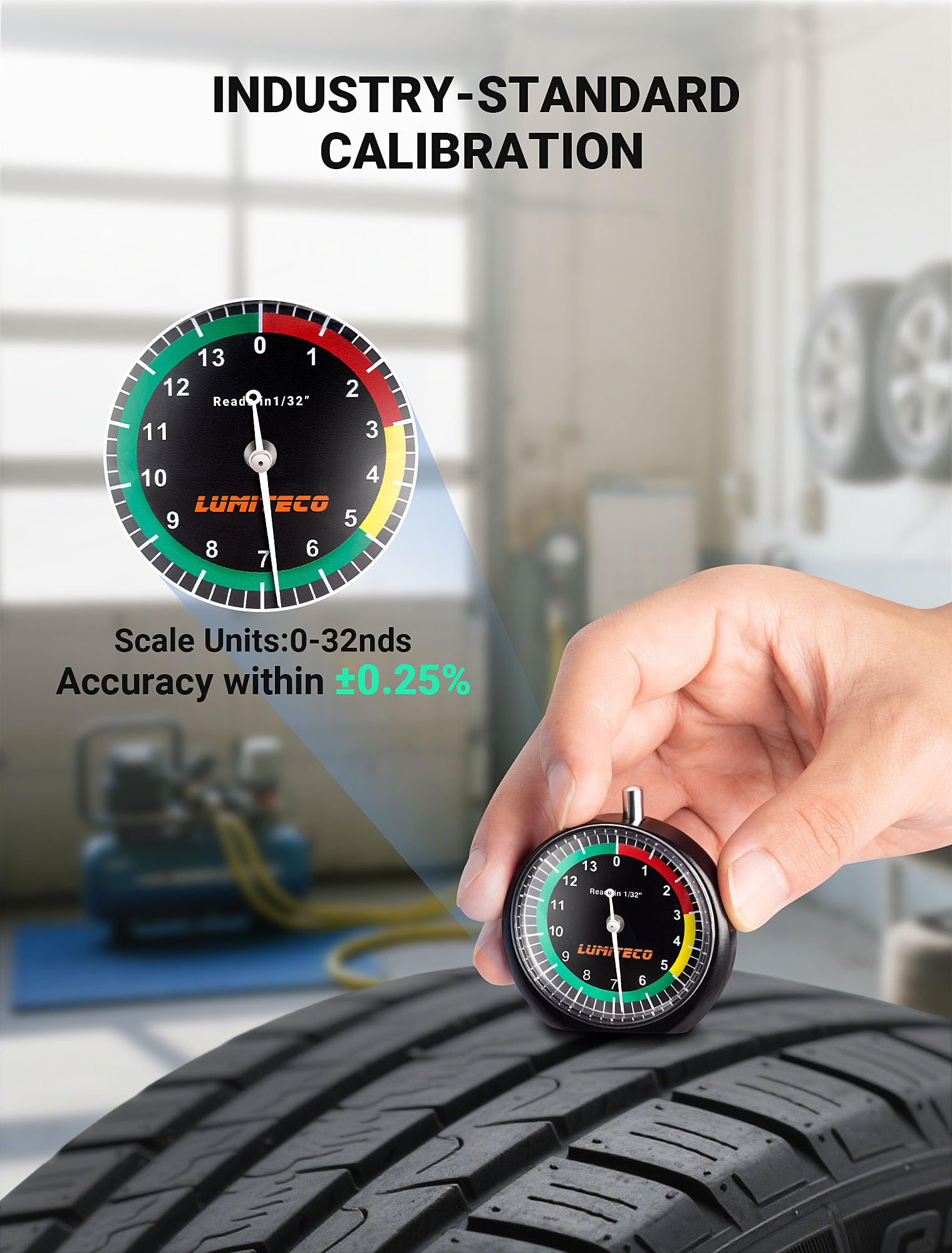 EASY TO READ AND ACCURATE: LUMITECO tire tread depth gauge has an easy-to-read 32nds scale, maximum tread depth of 14/32 inch. It offers precise readings in 1/32 inch increments (1/128 inch resolution). Ensure you know the exact tread depth of your tires for enhanced safety on the road.