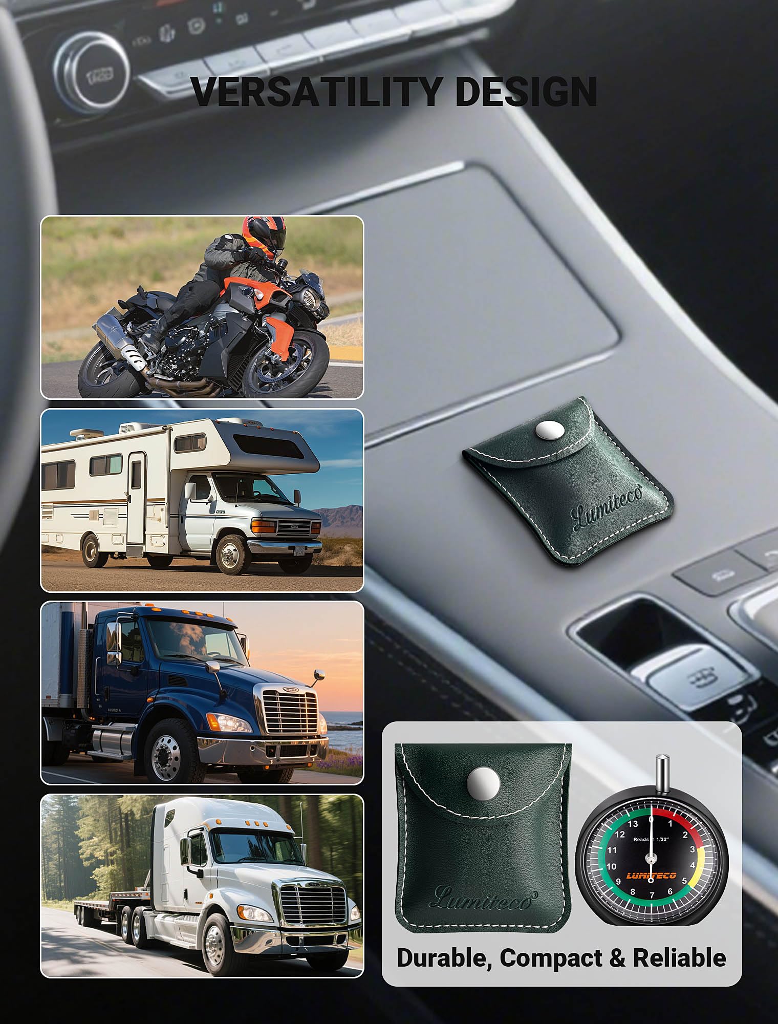RUGGED AND COMPACT: Easy to store and carry around. The included leather pouch not only protects the gauge but also makes it convenient to keep in your vehicle's glove compartment, toolbox, or when on the go. Ideal for use on a wide range of vehicles, including passenger cars, trucks, trailers, semi trucks, RVs, and motorcycles.
