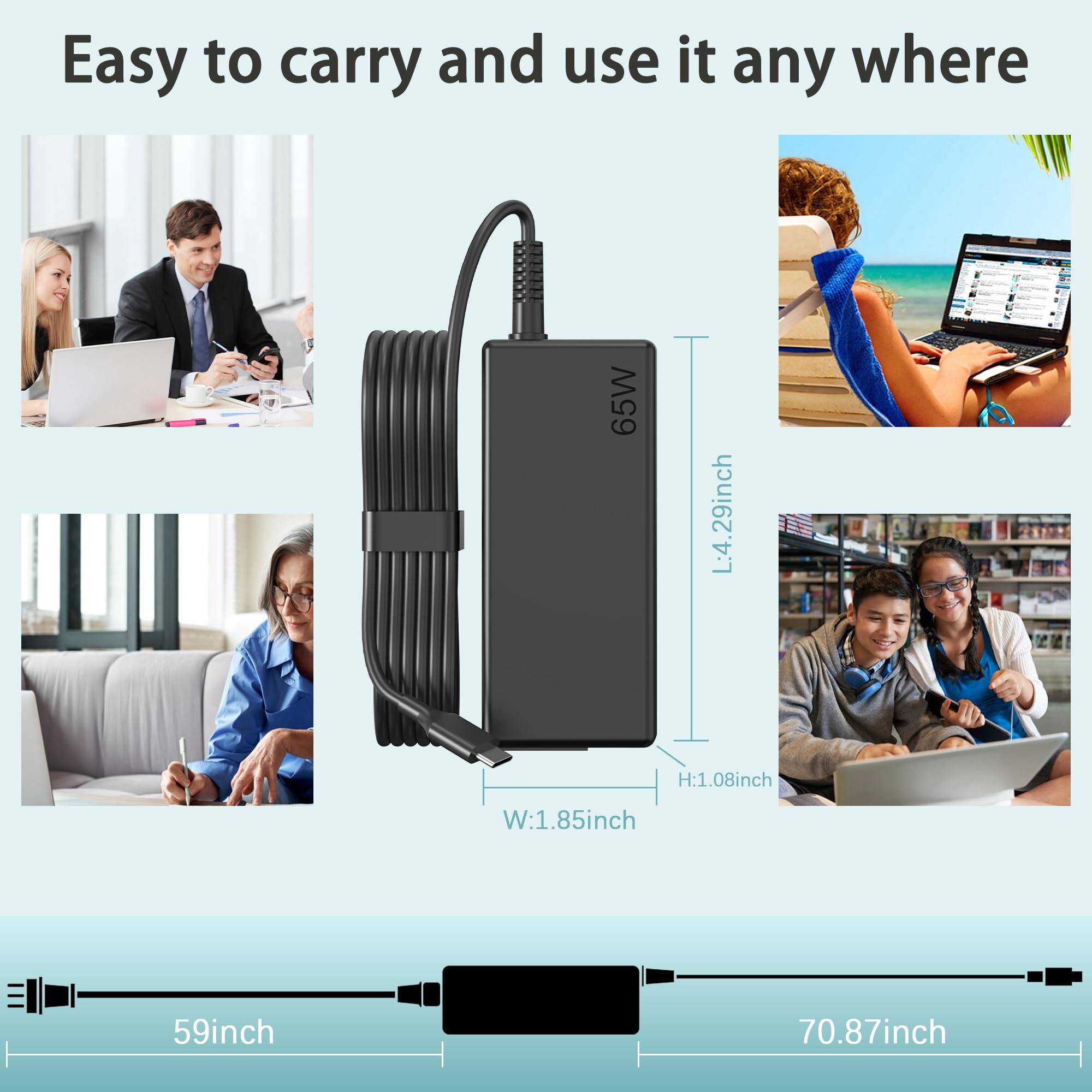 Safe & Efficient Charging: Engineered with Power Delivery (PD) 3.0 technology, this 65W USB C charger provides rapid power for your laptops. Input: 100-240V, Output: 5V/3A, 9V/3A, 15V/3A, 20V/3.25A. Multi-certified to ensure safe use during working, studying, or traveling.