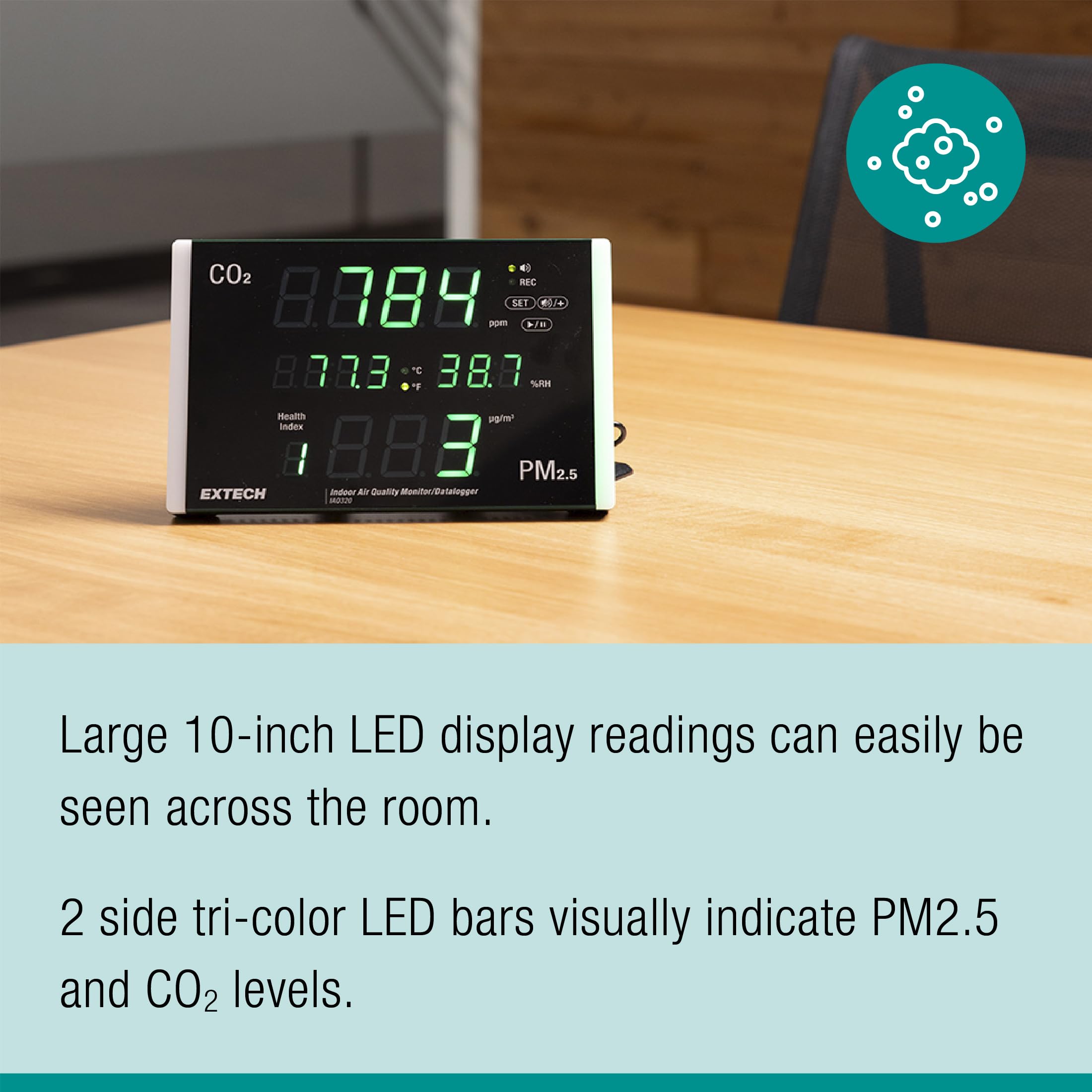 2 side tri-color LED bars visually indicate PM2.5 and CO2 levels