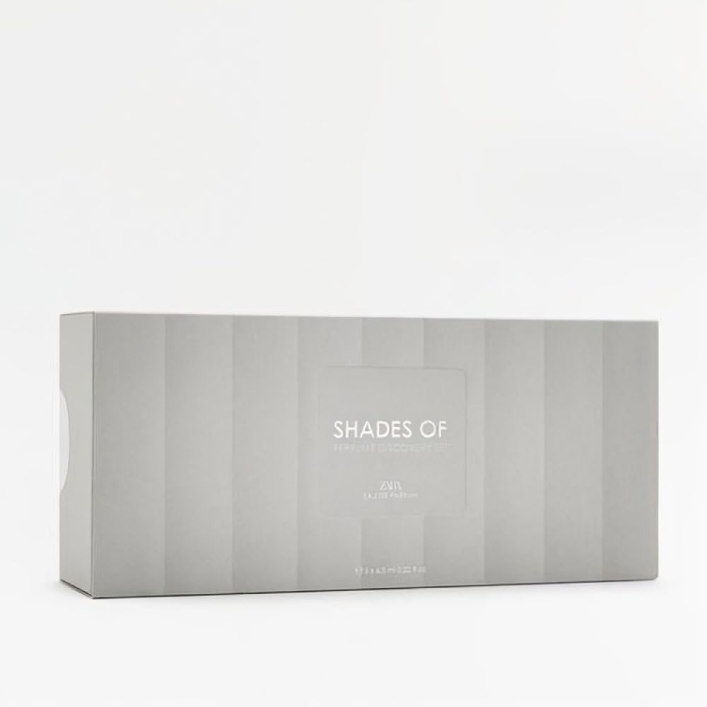 SHADES OF FRAGANCES DISCOVERY SET EDP 5 X 6.5 ML (0.22 FL. OZ): Eau de parfum set. Discover the 'Shades of' collection with this exclusive discovery set that contains all five fragrances: Bliss, Nirvana, Lust, Joy and Nostalgia. Each Eau de Parfum offers a unique experience, blending vibrant notes of kumquat, lush florals like gardenia and narcissus, and an indulgent touch of ruby chocolate and patchouli. This collection is the perfect invitation to explore a universe of sophisticated floral scents. ZARA SHADES OF BLISS EAU DE PARFUM CONTENTS: ALCOHOL DENAT. · FRAGRANCE (PARFUM) · WATER (AQUA) · BENZYL SALICYLATE · TETRAMETHYL ACETYLOCTAHYDRONAPHTHALENES · LINALOOL · HEXAMETHYLINDANOPYRAN · HEXYL CINNAMAL · VANILLIN · ETHYLHEXYL METHOXYCINNAMATE · ALPHA-ISOMETHYL IONONE · FARNESOL · COUMARIN · TOCOPHERYL ACETATE · BUTYL METHOXYDIBENZOYLMETHANE · ETHYLHEXYL SALICYLATE · CITRONELLOL · POGOSTEMON CABLIN OIL · HYDROXYCITRONELLAL · ISOEUGENYL ACETATE · BENZYL BENZOATE · ISOEUGENOL · CANANGA ODORATA OIL/EXTRACT · HEXADECANOLACTONE · BENZYL ALCOHOL · GERANYL ACETATE · beta-Caryophyllene · FD&C Yellow No. 5 (CI 19140) · D&C Red No. 33 (CI 17200) · FD&C Blue No. 1 (CI 42090) ZARA SHADES OF NIRVANA EAU DE PARFUM CONTENTS: ALCOHOL DENAT. · WATER (AQUA) · FRAGRANCE (PARFUM) · HEXAMETHYLINDANOPYRAN · TETRAMETHYL ACETYLOCTAHYDRONAPHTHALENES · BENZYL SALICYLATE · JUNIPERUS VIRGINIANA OIL · VANILLIN · LINALOOL · ETHYLHEXYL METHOXYCINNAMATE · LINALYL ACETATE · FARNESOL · GERANIOL · TOCOPHERYL ACETATE · TRIMETHYLCYCLOPENTENYL METHYLISOPENTENOL · BUTYL METHOXYDIBENZOYLMETHANE · ETHYLHEXYL SALICYLATE · LIMONENE · ALPHA-ISOMETHYL IONONE · PINENE · CITRONELLOL · BENZALDEHYDE · SANTALUM ALBUM OIL · beta-Caryophyllene · SANTALOL · CITRAL · HEXADECANOLACTONE · BENZYL ALCOHOL · TERPINOLENE · EUGENIA CARYOPHYLLUS OIL · EUGENOL · D&C Red No. 33 (CI 17200) · FD&C Yellow No. 5 (CI 19140) · FD&C Blue No. 1 (CI 42090) ZARA SHADES OF LUST EAU DE PARFUM CONTENTS: ALCOHOL DENAT. · WATER (AQUA) · FRAGRANCE (PARFUM) · TETRAMETHYL ACETYLOCTAHYDRONAPHTHALENES · HEXAMETHYLINDANOPYRAN · LIMONENE · HYDROXYCITRONELLAL · VANILLIN · CITRUS AURANTIUM BERGAMIA PEEL OIL · LINALOOL · JUNIPERUS VIRGINIANA OIL · LINALYL ACETATE · CITRUS LIMON PEEL OIL · GERANYL ACETATE · CITRUS AURANTIUM PEEL OIL · ETHYLHEXYL METHOXYCINNAMATE · PINENE · FARNESOL · CITRONELLOL · GERANIOL · TOCOPHERYL ACETATE · BUTYL METHOXYDIBENZOYLMETHANE · ETHYLHEXYL SALICYLATE · CITRAL · ROSE KETONES · beta-Caryophyllene · POGOSTEMON CABLIN OIL · TERPINOLENE · ROSE FLOWER OIL/EXTRACT · TERPINEOL · ALPHA-TERPINENE · HEXADECANOLACTONE · CITRUS AURANTIUM FLOWER OIL · CARVONE · FD&C Yellow No. 5 (CI 19140) · D&C Red No. 33 (CI 17200) · FD&C Blue No. 1 (CI 42090) ZARA SHADES OF JOY EAU DE PARFUM CONTENTS: ALCOHOL DENAT. · WATER (AQUA) · FRAGRANCE (PARFUM) · TETRAMETHYL ACETYLOCTAHYDRONAPHTHALENES · HEXAMETHYLINDANOPYRAN · HYDROXYCITRONELLAL · LIMONENE · LINALYL ACETATE · ETHYLHEXYL METHOXYCINNAMATE · FARNESOL · LINALOOL · VANILLIN · TOCOPHERYL ACETATE · BUTYL METHOXYDIBENZOYLMETHANE · ETHYLHEXYL SALICYLATE · PINENE · GERANYL ACETATE · CITRAL · beta-Caryophyllene · TERPINOLENE · CITRUS AURANTIUM FLOWER OIL · GERANIOL · HEXADECANOLACTONE · TERPINEOL · ALPHA-TERPINENE · CITRONELLOL · ROSE KETONES · D&C Red No. 33 (CI 17200) · FD&C Blue No. 1 (CI 42090) · FD&C Yellow No. 5 (CI 19140) ZARA SHADES OF NOSTALGIA EAU DE PARFUM CONTENTS: ALCOHOL DENAT. · FRAGRANCE (PARFUM) · WATER (AQUA) · TETRAMETHYL ACETYLOCTAHYDRONAPHTHALENES · LINALOOL · HEXAMETHYLINDANOPYRAN · HEXYL CINNAMAL · LIMONENE · CITRUS LIMON PEEL OIL · HYDROXYCITRONELLAL · ETHYLHEXYL METHOXYCINNAMATE · LINALYL ACETATE · FARNESOL · DIMETHYL PHENETHYL ACETATE · ISOEUGENYL ACETATE · PINENE · TOCOPHERYL ACETATE · BUTYL METHOXYDIBENZOYLMETHANE · ETHYLHEXYL SALICYLATE · CITRONELLOL · VANILLIN · CITRAL · CANANGA ODORATA OIL/EXTRACT · ROSE KETONES · TERPINOLENE · beta-Caryophyllene · GERANYL ACETATE · HEXADECANOLACTONE · ALPHA-TERPINENE · BENZYL BENZOATE · TERPINEOL · JASMINE OIL/EXTRACT · ISOEUGENOL · BENZALDEHYDE · BENZYL SALICYLATE · FD&C Yellow No. 5 (CI 19140) · FD&C Blue No. 1 (CI 42090) · D&C Red No. 33 (CI 17200)
