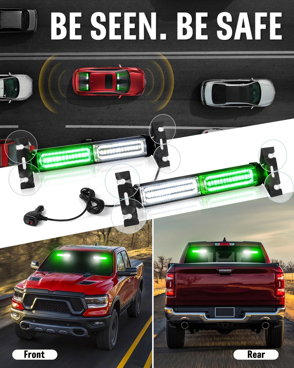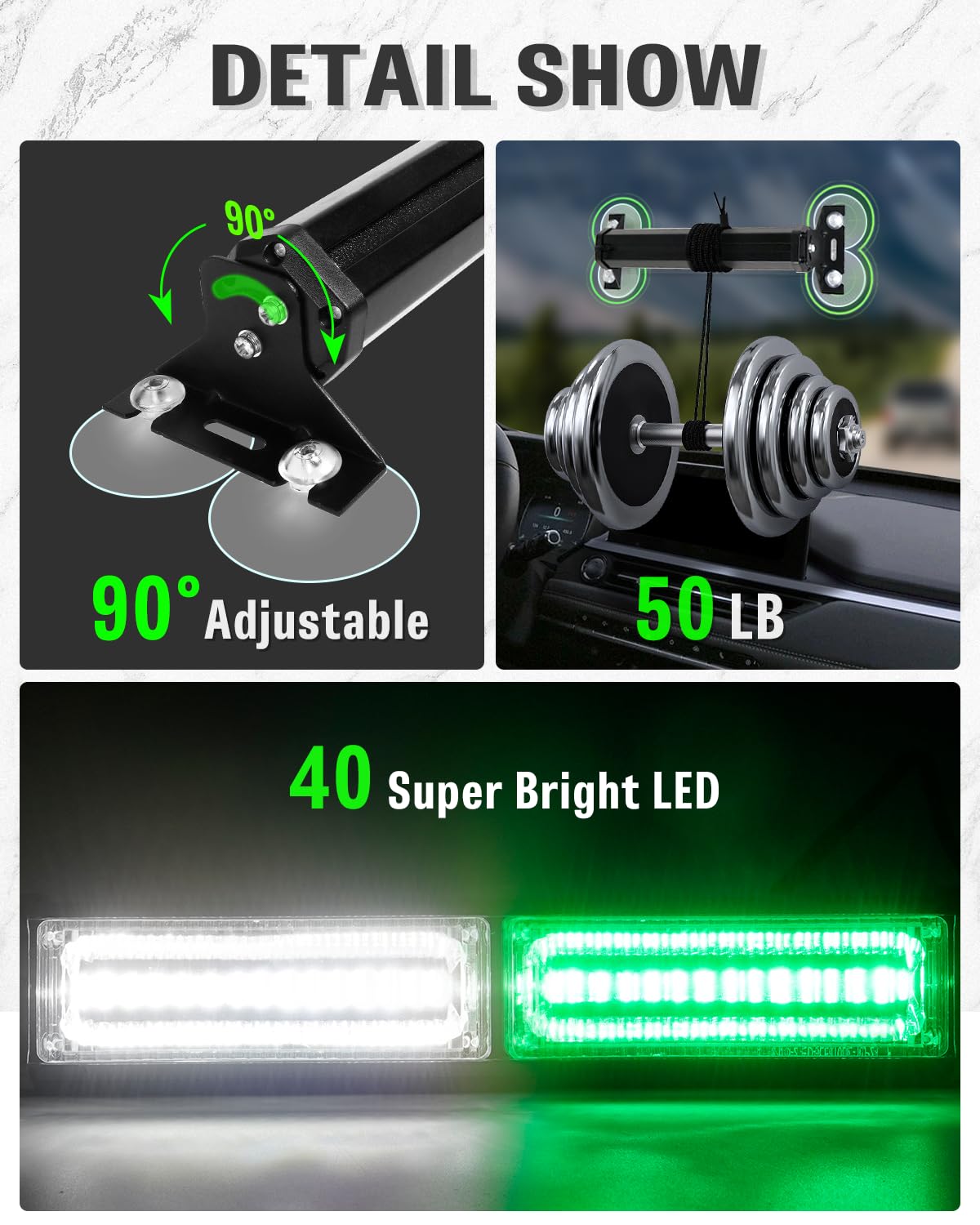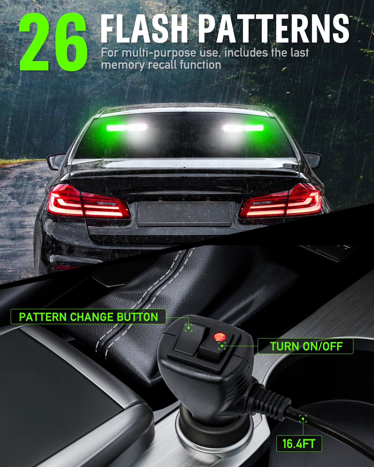 【EASY TO INSTALL】: Equipped with 4 and 90° adjustable strong and stability suction cups brackets, 8 strong suction cups, and 16.4ft long cable, you can easily install this 2 in 1 windshield emergency strobe lights on your rear/front windshield, and exterior of vehicles