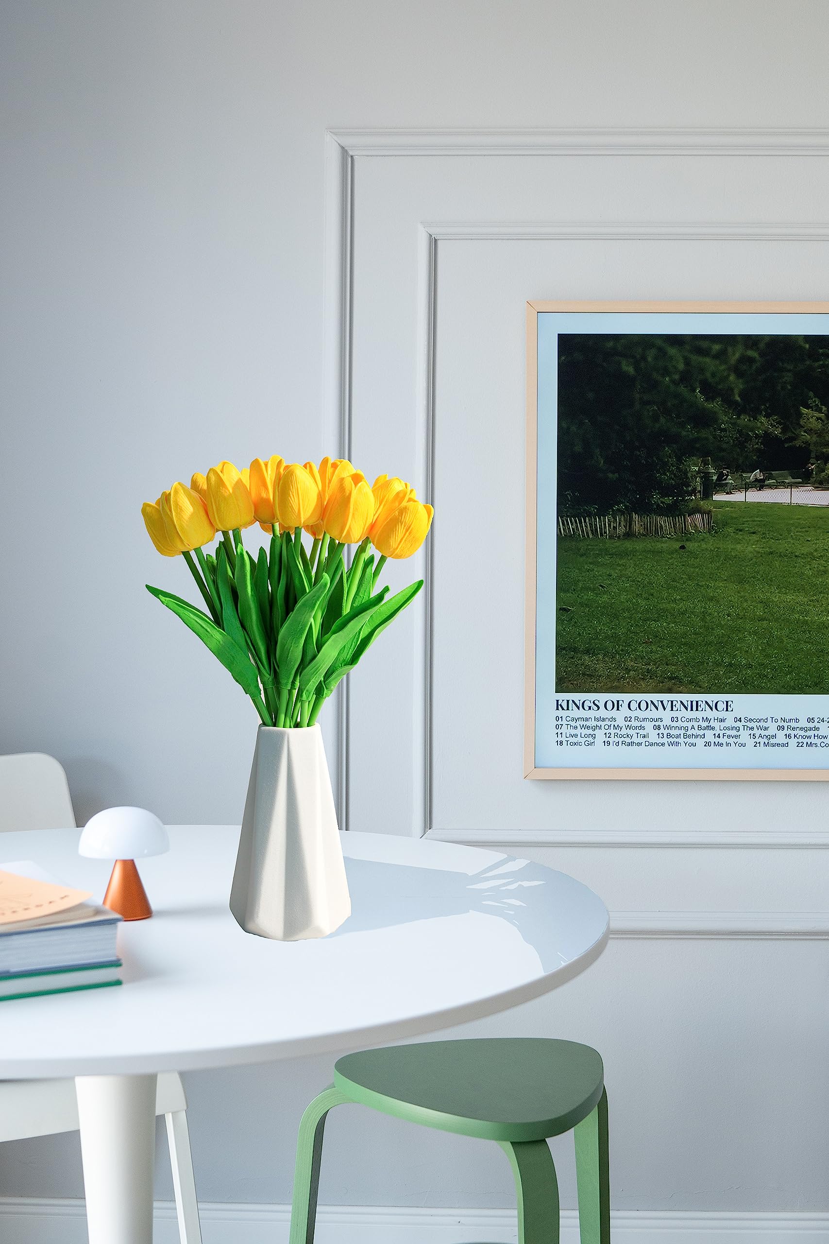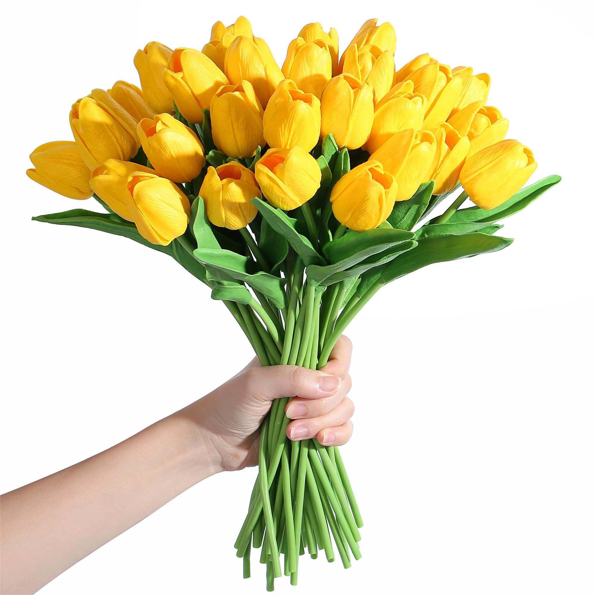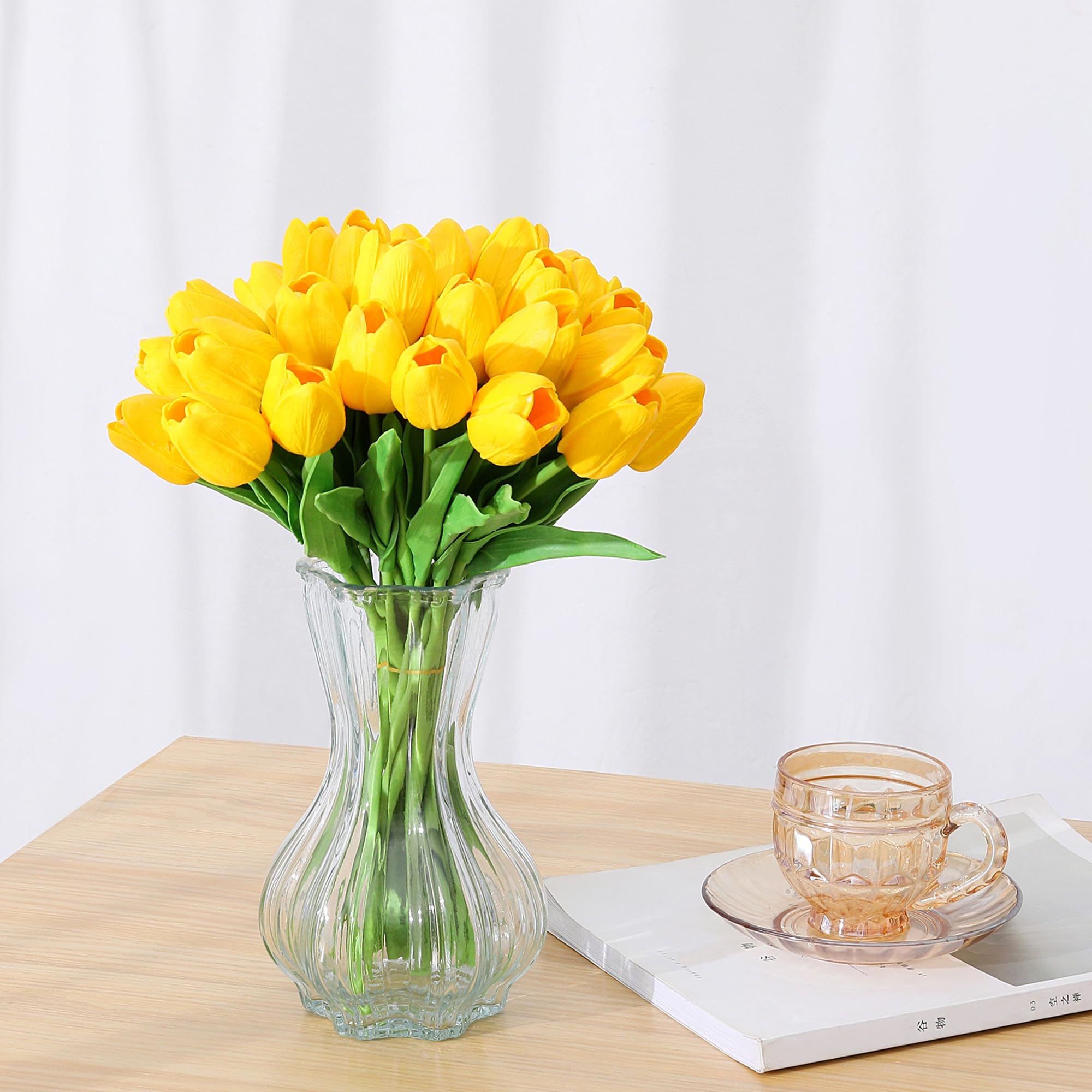【Size of faux tulips】Faux flowers tulips' size is 14"/35cm.Including 15pcs tulips per pack and vase not included.