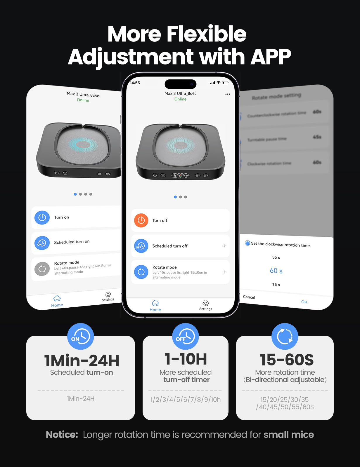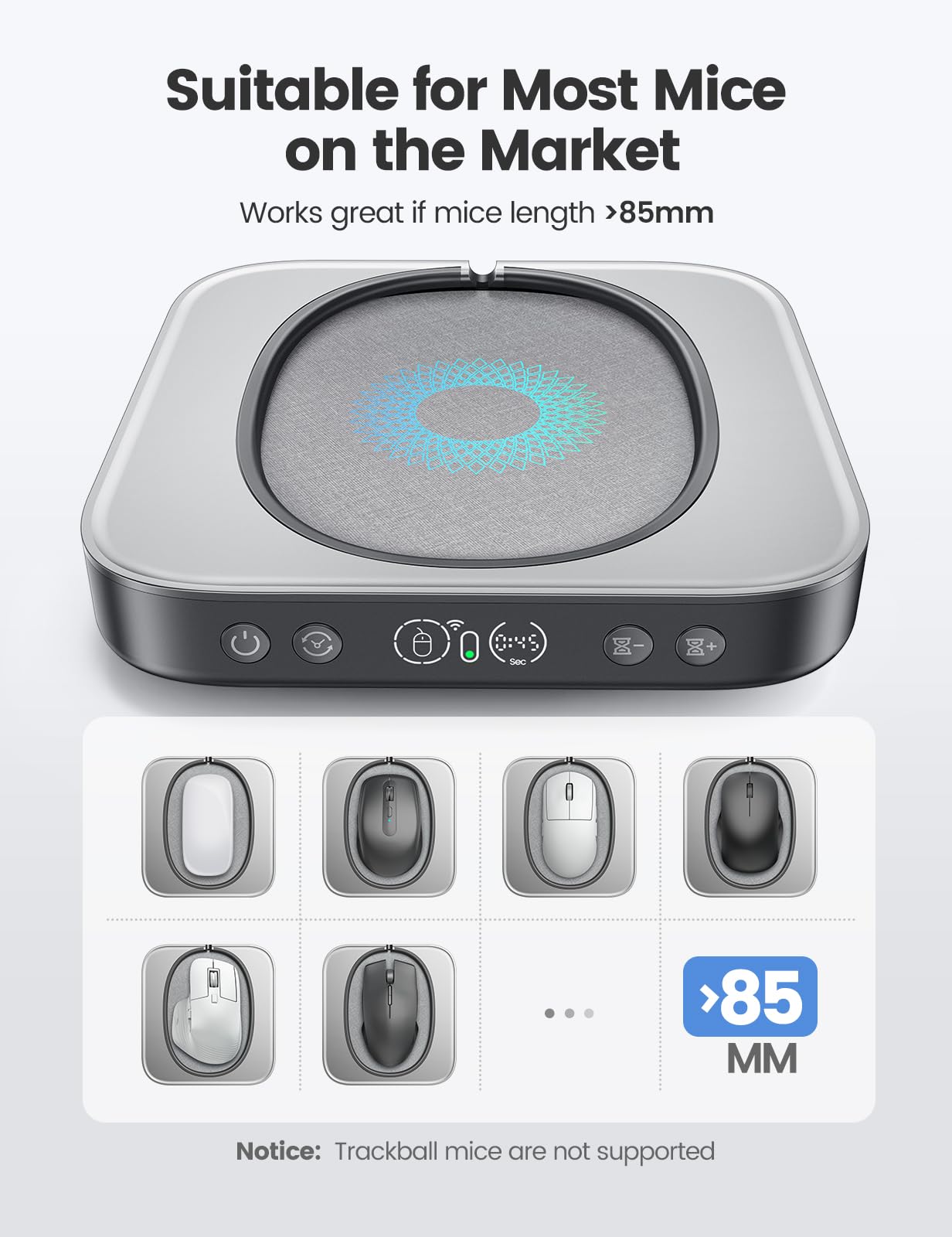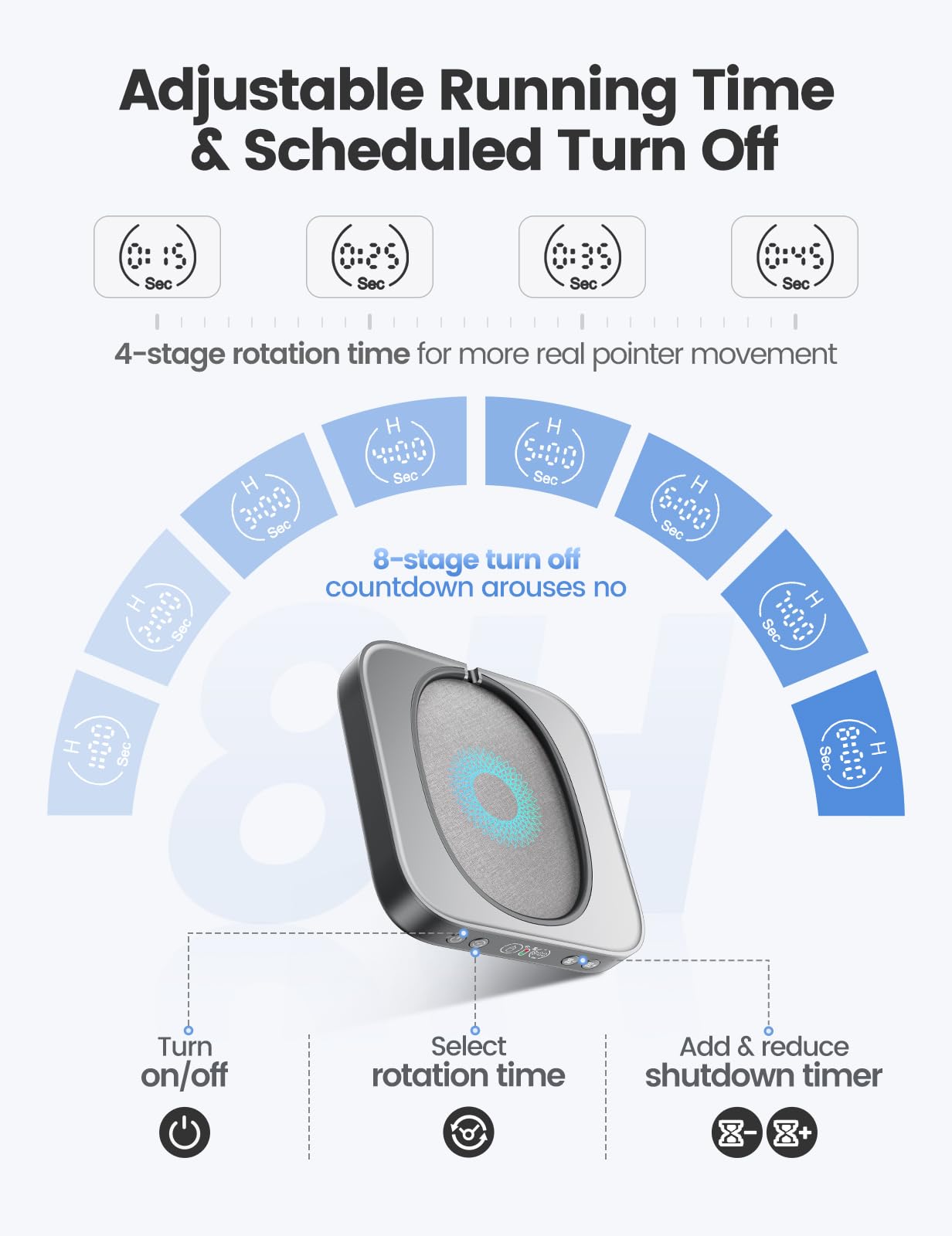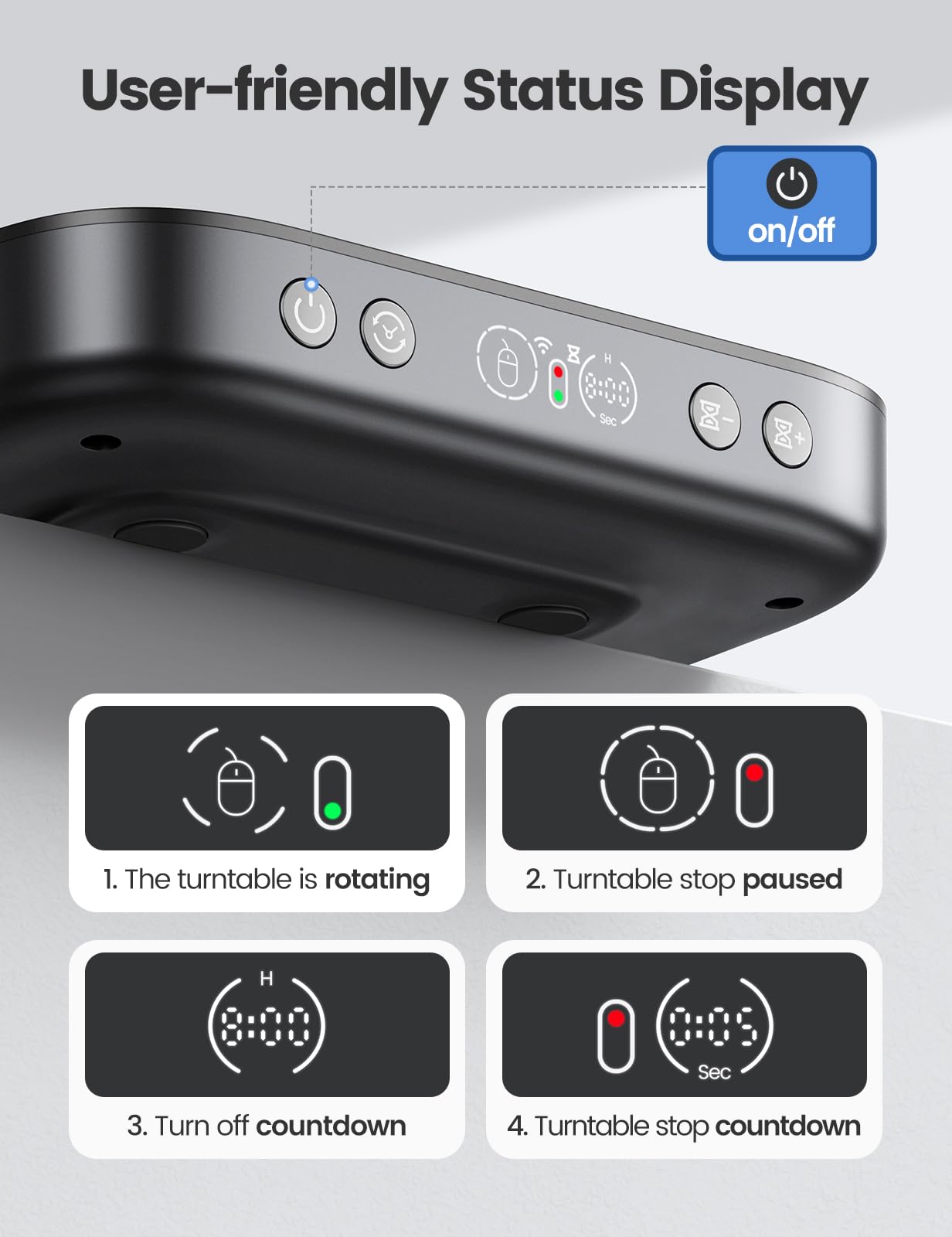【Running Frequency Adjustable & Visualized】Meatanty mechanical mouse mover can not only adjust the moving frequency but also visualize your operations through its LED display. Press the "+" or "-" button to set the time for the turntable to move automatically the mouse cursor once (Each press increases or decreases by 5 seconds each).The adjustable time frequency is: 5-60 S, which really meets your different usage needs!