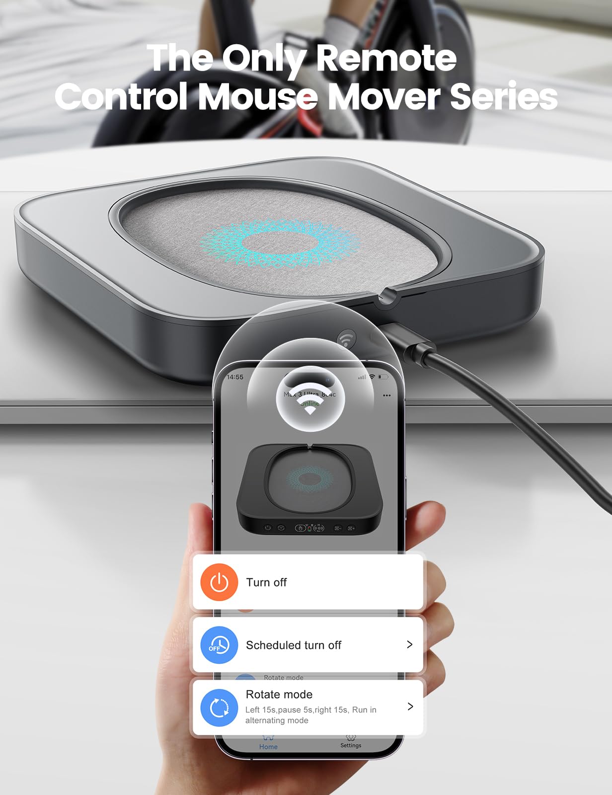 【Upgraded with Remote App Control & Timer Shutdown】The latest upgrade allows you to control your mouse mover remotely using a convenient app. You can fine-tune the pause time between movements and set the operation duration for a more tailored experience. Additionally, the app gives you the option to schedule the device to automatically power off after 1-8 hours, or you can set it to run without interruption. Whether at home or the office, this remote control feature adds extra convenience and flexibility to your setup.