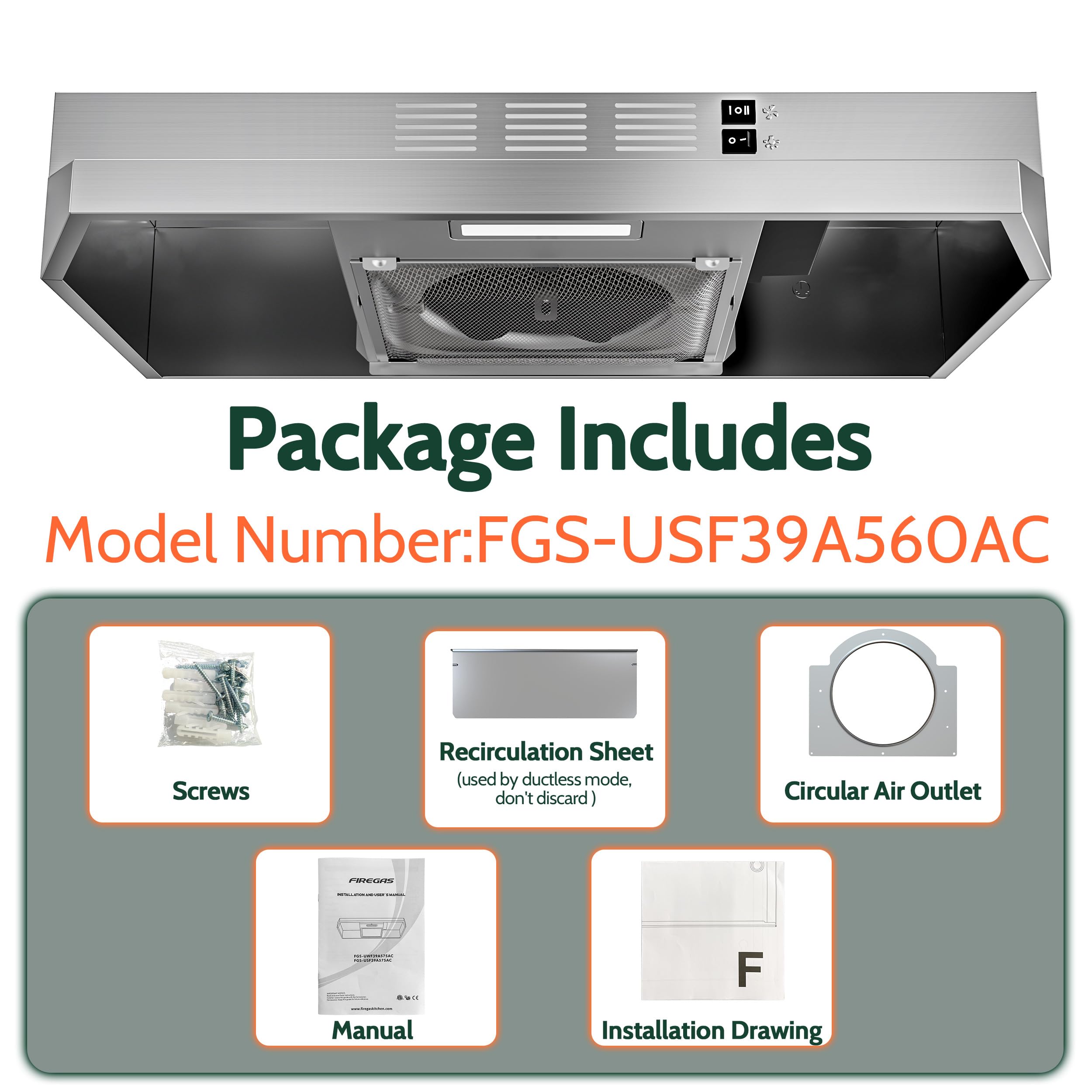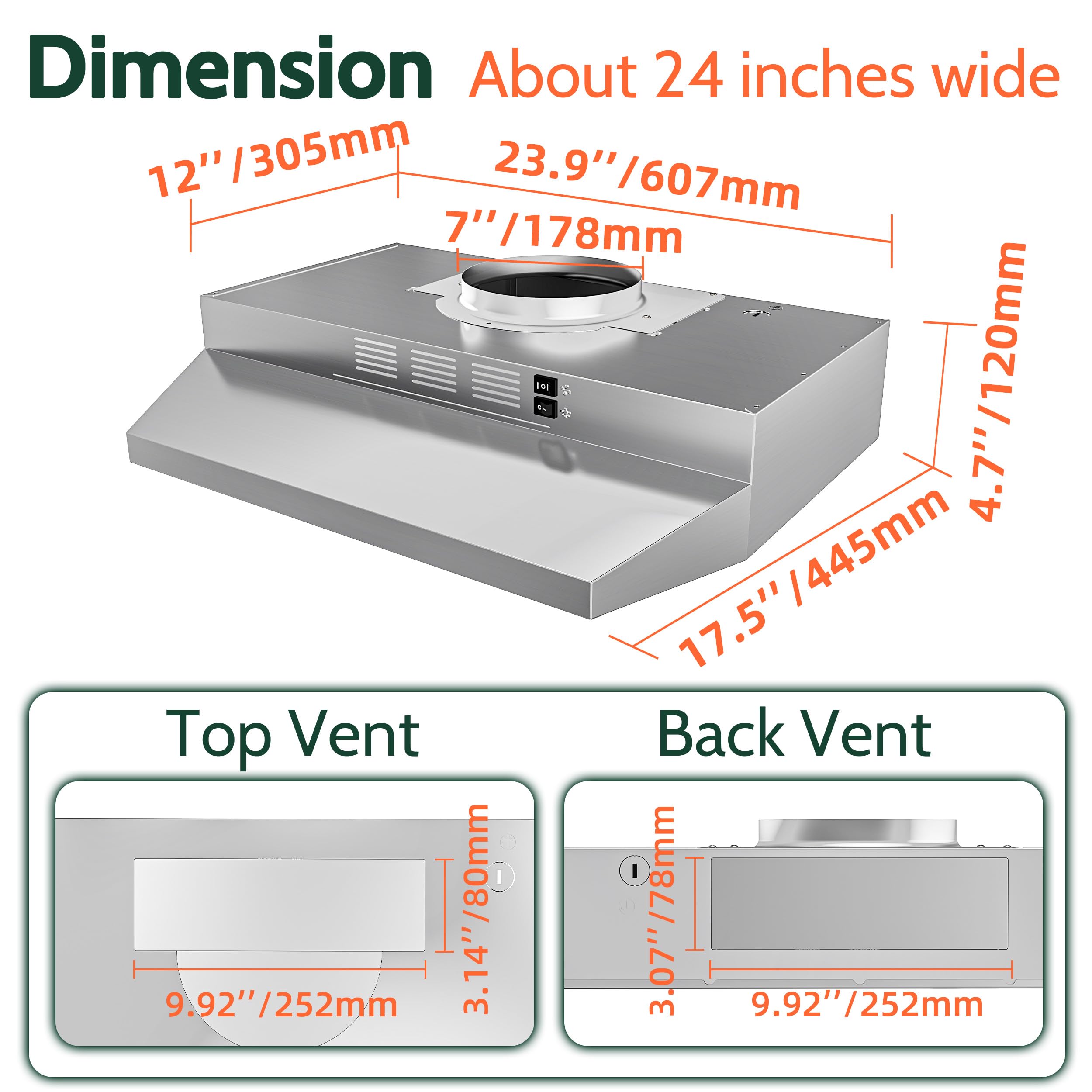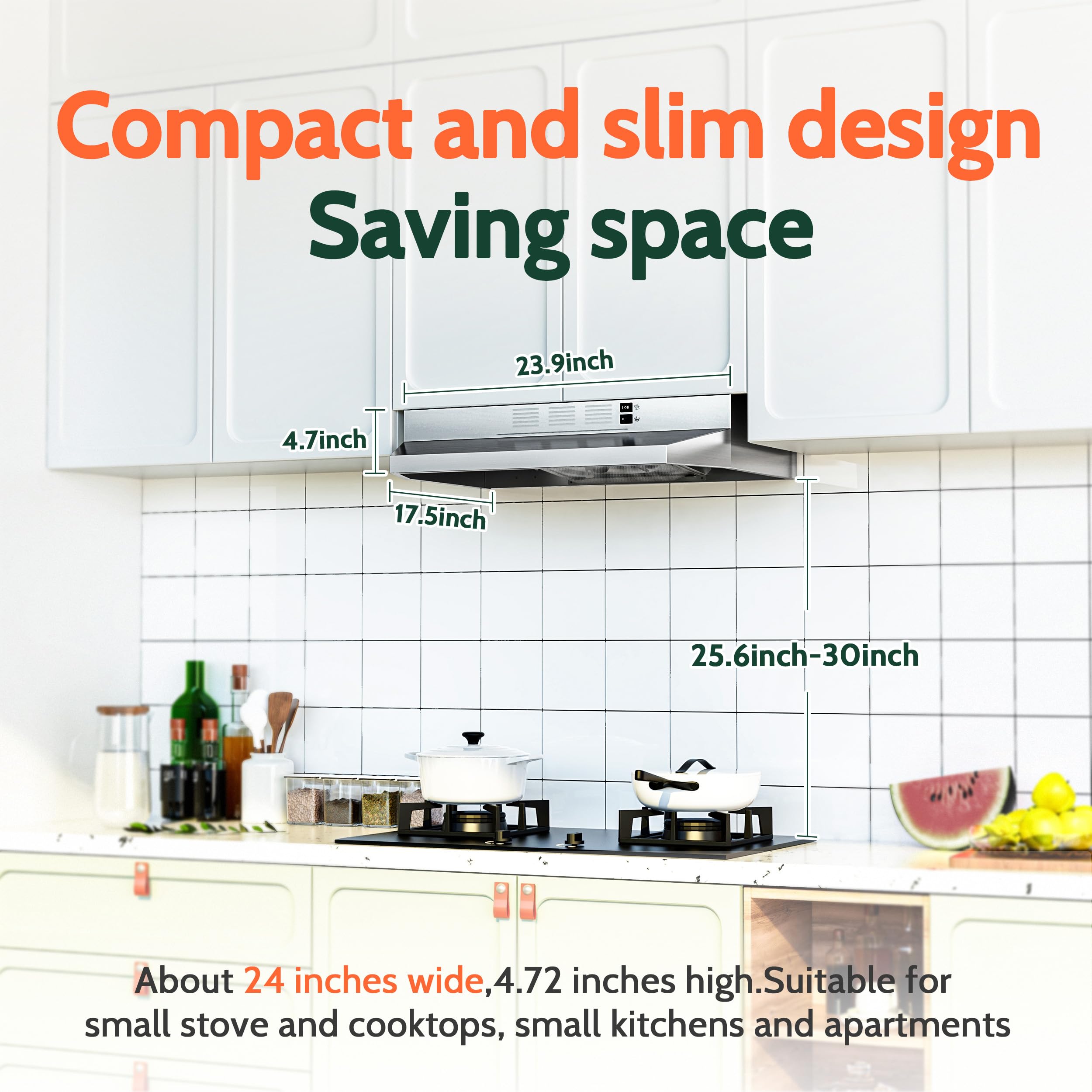 24 INCH RANGE HOOD: This FIREGAS range hood has a flat design, which saves a lot of space, contemporary look, so this under cabinet range hood is a perfect complement to your stainless steel appliances
