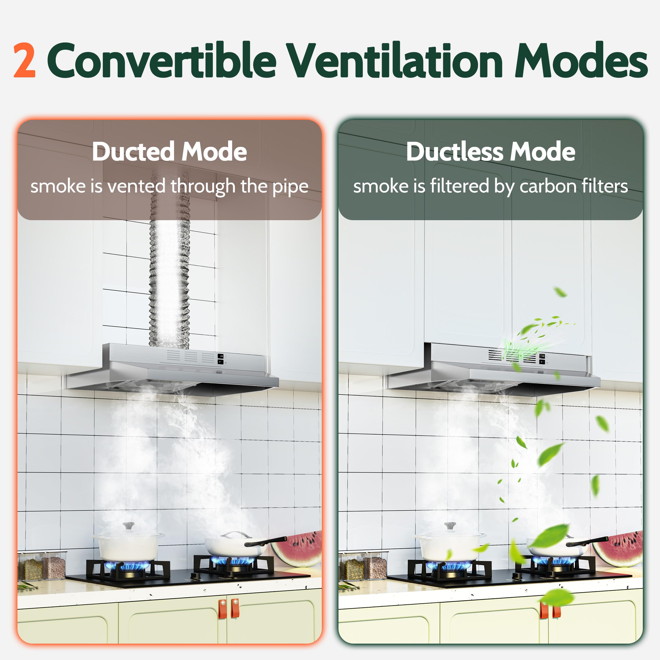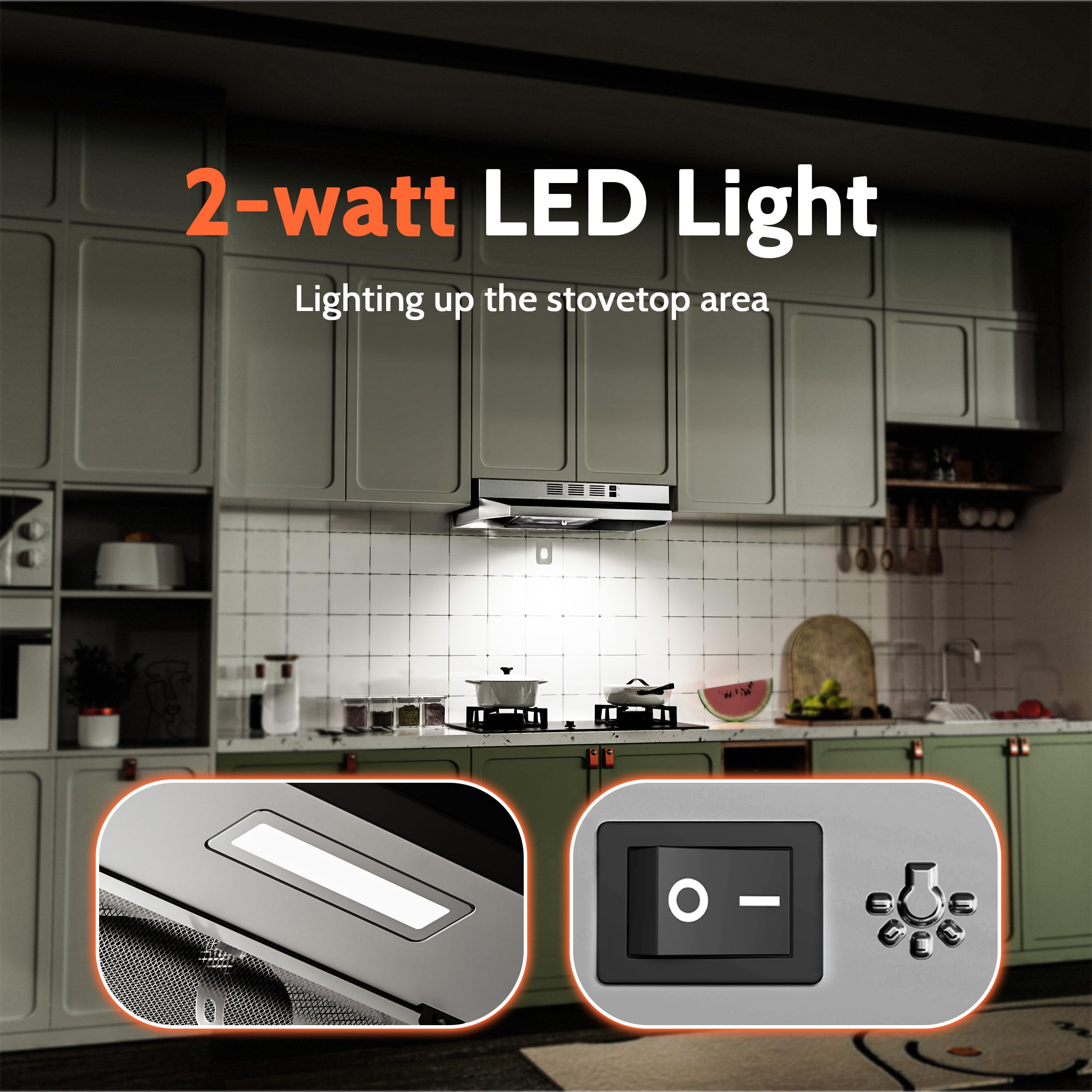 BRIGHT LED LIGHT: The 24 inch under cabinet range hood has a 2W LED light, which brightens your cooking area, ensuring optimal visibility for your culinary endeavors, It can also save energy in your kitchen