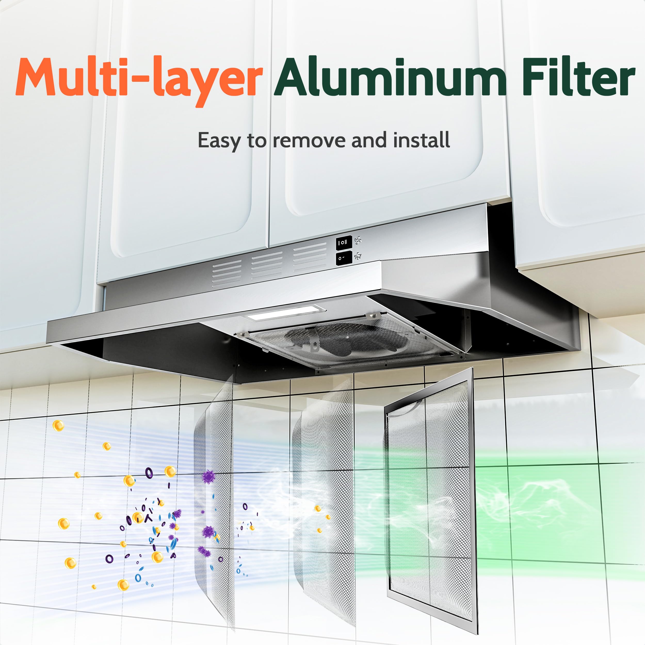 POWERFUL SUCTION VENT HOOD: 300 CFM large airflow with good balance fan efficiently removes large amounts of smoke and cooking odors with ease from your kitchen. Multi-layer aluminum filter with excellent filtration ability to capture grease and oil