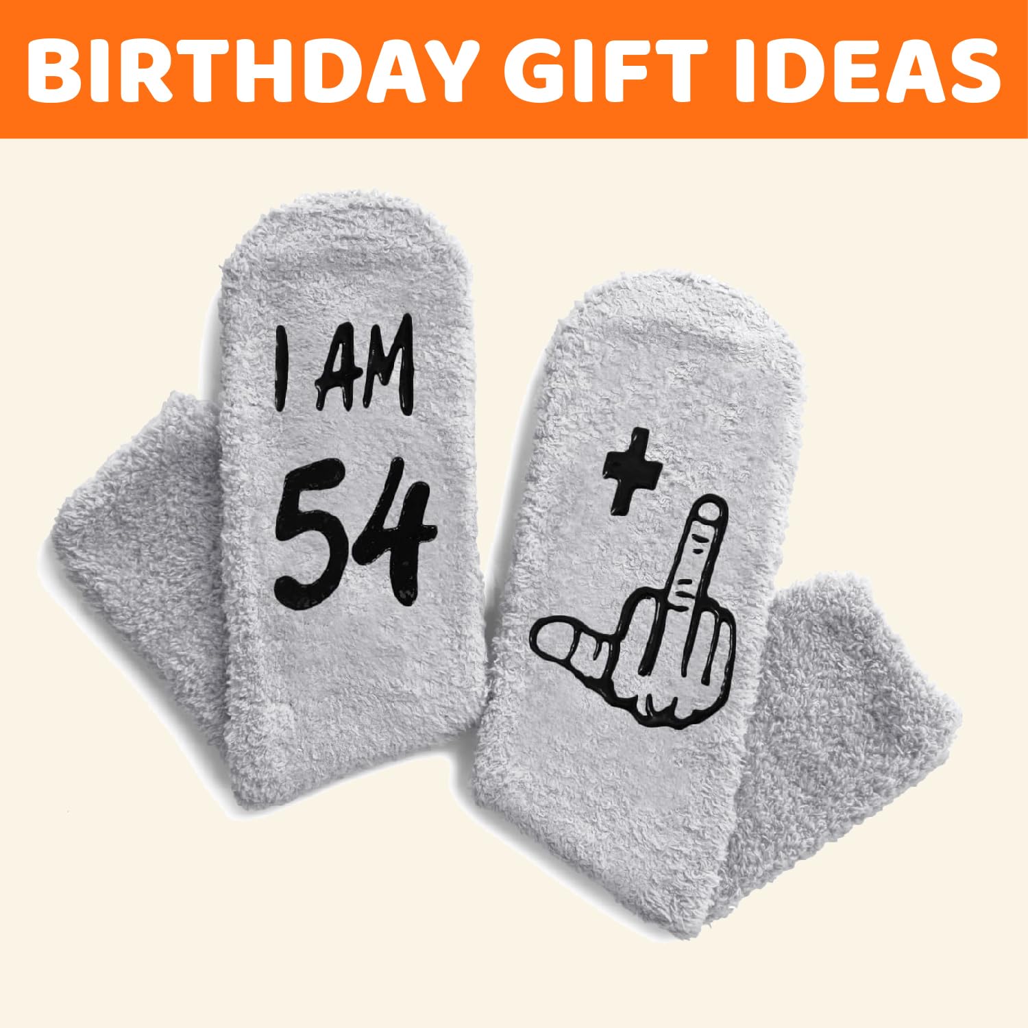 GIFTS FOR MEN IN THEIR 55S: "I AM 54+." Say it with socks - These are suitable for any holiday gifts, like Birthday gifts, White Elephant gifts, Christmas gifts, Fathers Day gifts.