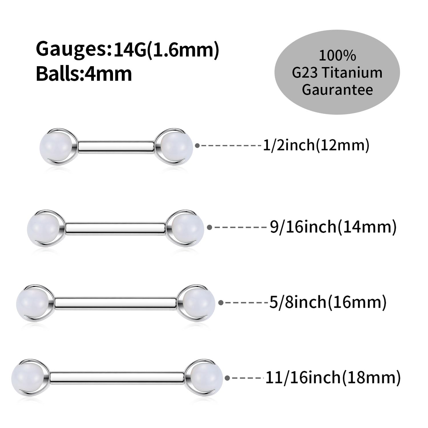 Size and Color: gauge: 14G (1.6 mm); Nipple Barbell Length: 1/2"(12 mm); Ball Size: 4 mm. Color: Silver with white rainbow stone. 2pcs nipple rings per order
