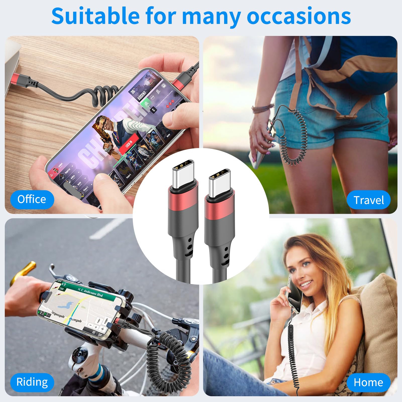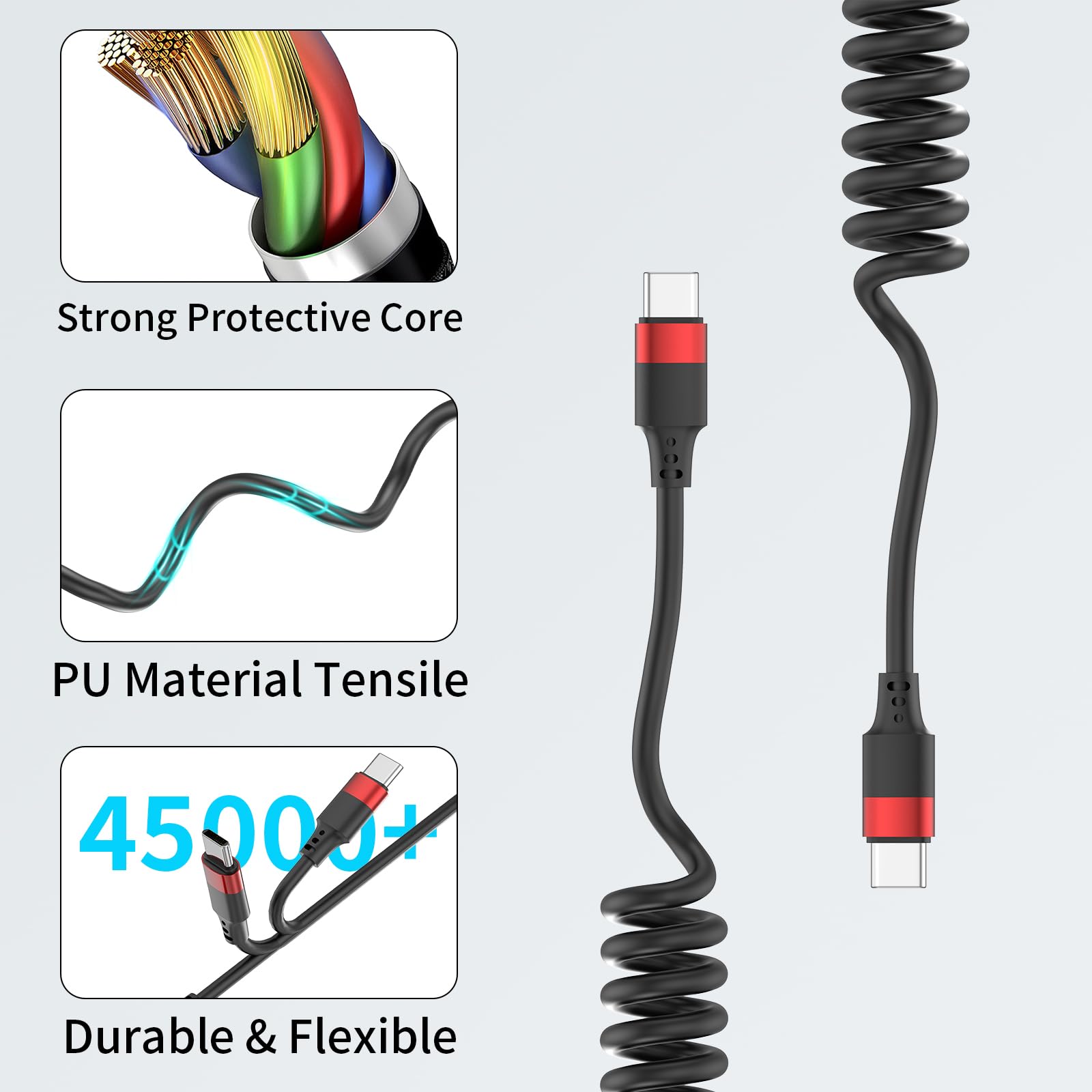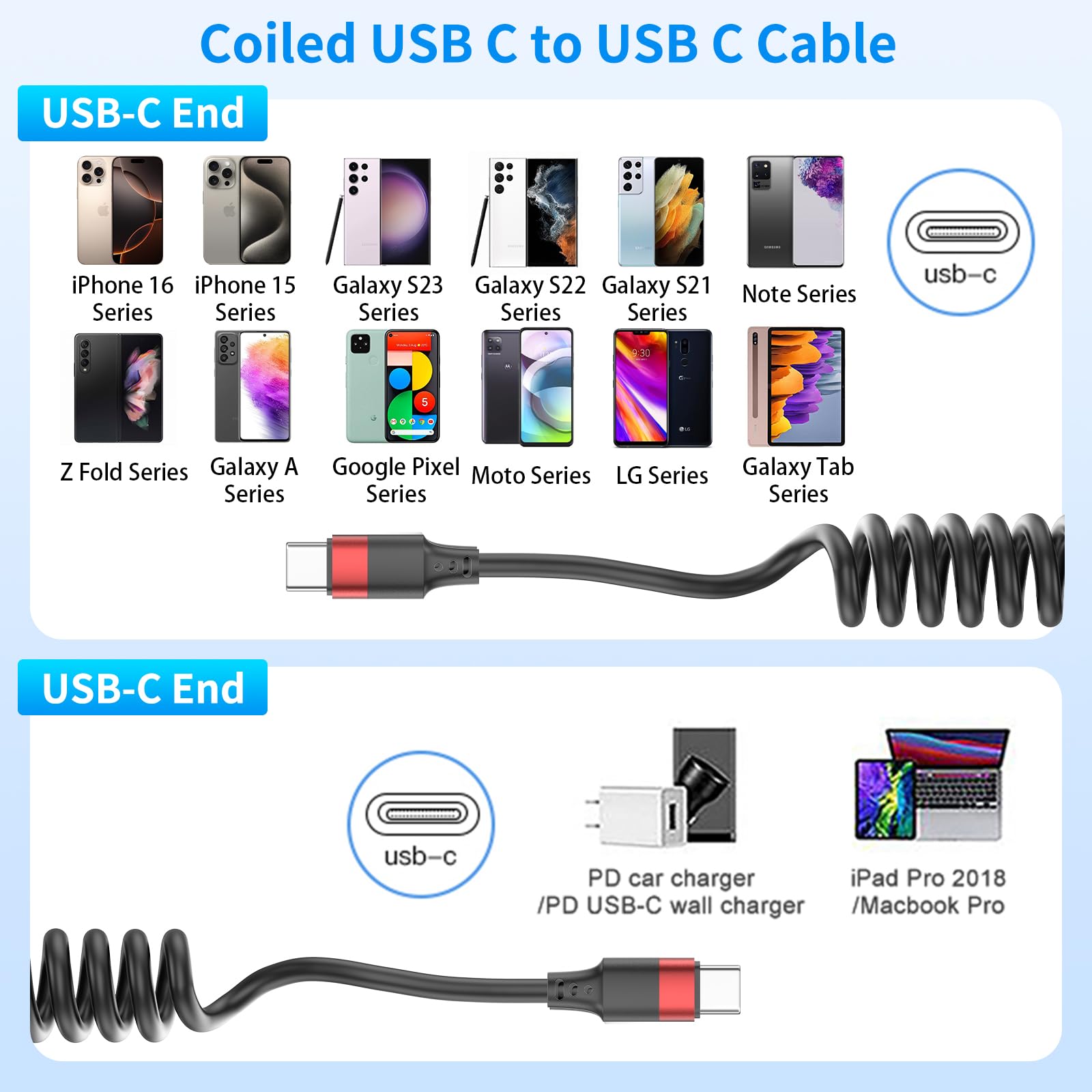 Coiled USBC to USBC: The usbc to usbc coiled cable with spring shaped design makes it compact, space-saving, easy to carry and knot-free, perfect for your car(Note: Your vehicle must be equipped with a USB-C port). It features USB-C connectors on both ends, so you'll need a dedicated USB-C charger to power your devices.
