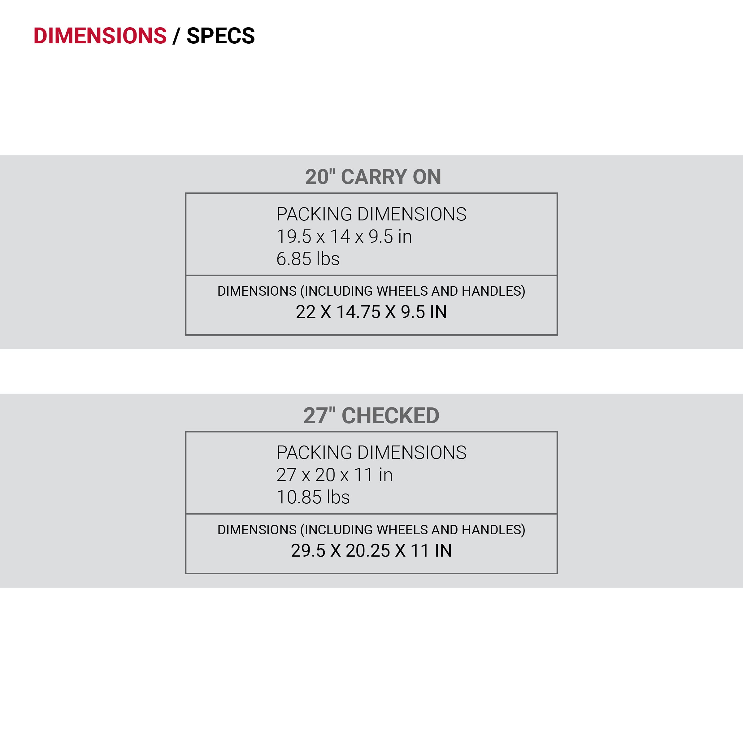 SET DIMENSIONS: 20” Carry-On Spinner (Packing Dimensions: 19.5” x 14” x 9.5”, Product Dimensions: 22” x 14.75” x 9.5”, Weight: 6.85 lbs.); 27” Checked Spinner (Packing Dimensions: 27” x 20” x 11”, Product Dimensions: 29.5” x 20.25” x 11”, Weight: 10.85 lbs.; Luggage Product Dimensions include wheels and handles