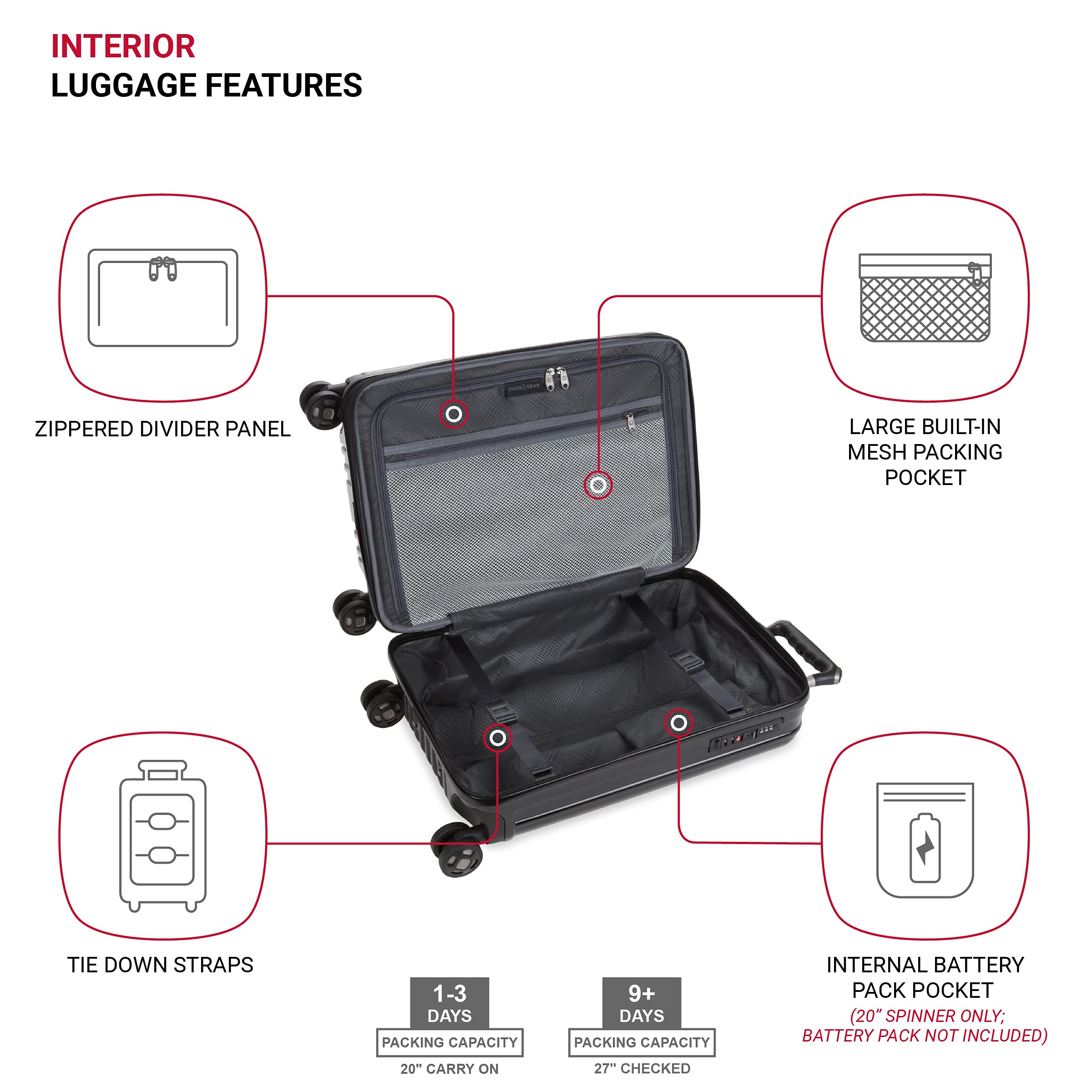 Description Traveling has never been such a pleasure. Introducing the SwissGear 7910 Expandable 2pc Hardside Luggage Set. Made of an extremely durable molded polycarbonate hardshell in a brushed satin finish texture, this collection is comprised of a 20” carry-on, and a 27” checked spinner. Featuring a large oversize main zipper, a low-profile TSA-accepted combination lock, fabric wrapped lift handles, and eight multi-directional spinner wheels, this luggage also comes equipped with a twin push button locking retractable handle for the ultimate in convenience for both left and right-handed users. Constructed using an expandable split-case design for naturally superior packing organization, this luggage also features a rich, fully lined interior, adjustable clothing tie-down straps, a zippered divider panel with a built-in flat packing pocket, and an integrated USB port that connects to an internal portable power bank that can charge your smartphone and other electronics when you’re on the go (20” spinner only; battery pack NOT INCLUDED).
