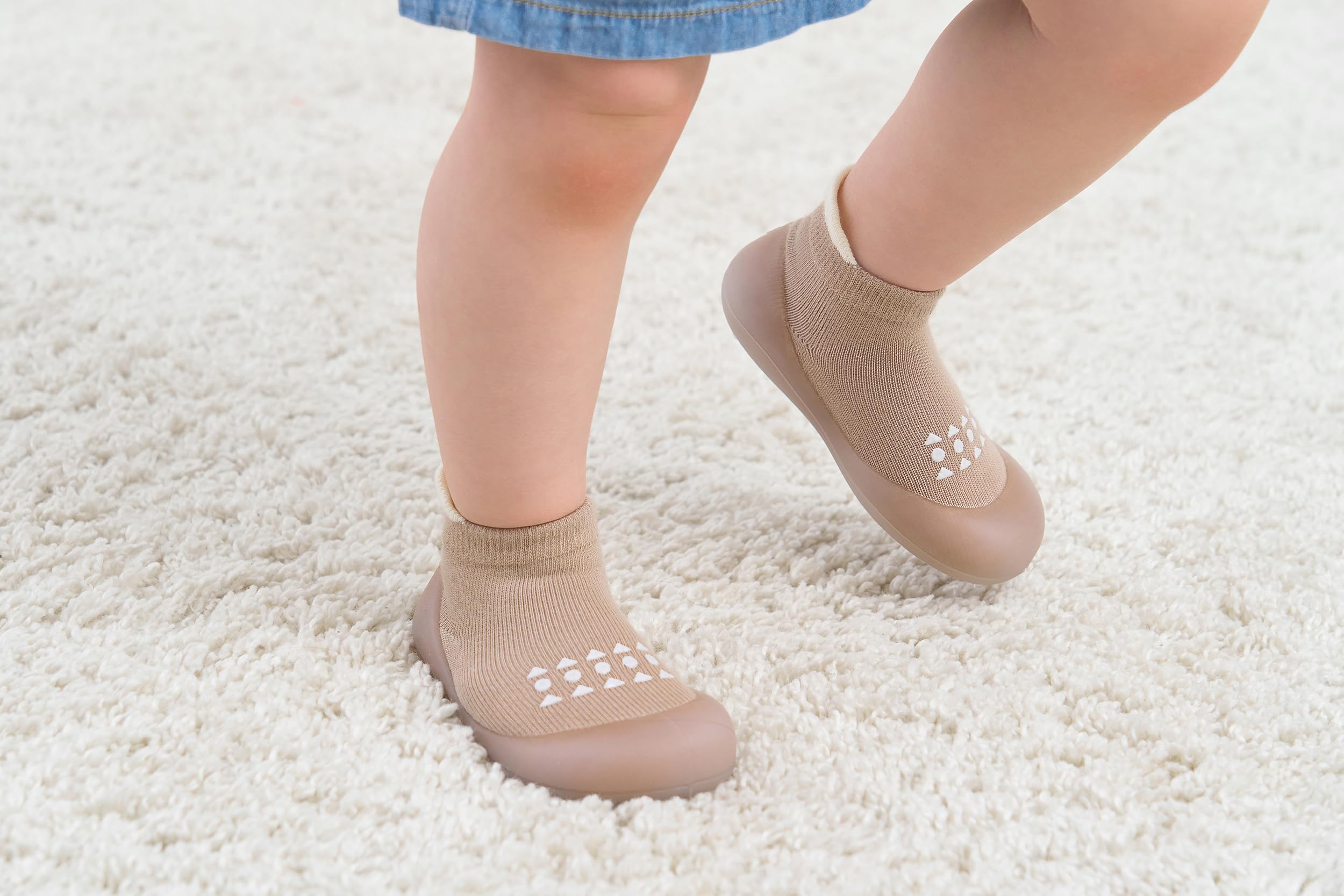 Non Slip:Sock shoe sole is made of non-slip rubber material. thanks to baby walking shoes design, it touches the ground flat. At the same time, The thickened rubber sole of walking shoes for babies hugs the foot from both the front and the back, offer extra protection from sharp objects. It allows your toddlers to walk safely on different surfaces.