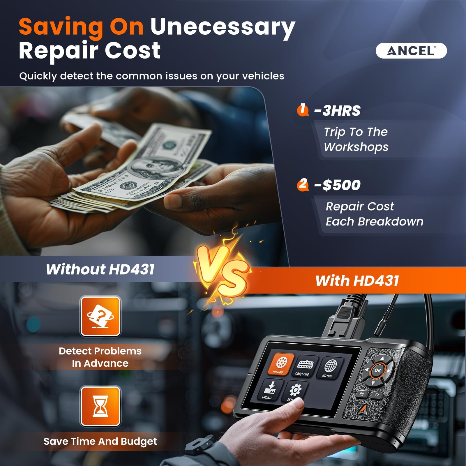 Why Choose HD431: Compared to other truck scanners on the market, with unique advantages, it supports DPF functions for Paccar and Detroit engines, and offers life-time free updates for software and versions, saving truck drivers hundreds of dollars in repairs. Moreover, with 6 & 9 pin, 16 pin diverse connectors, our decvice is highly compatible with American trucks. Equipped with a 4.3-inch HD screen and 8G memory, its user-friendly hardware design makes it more convenient for truck drivers to