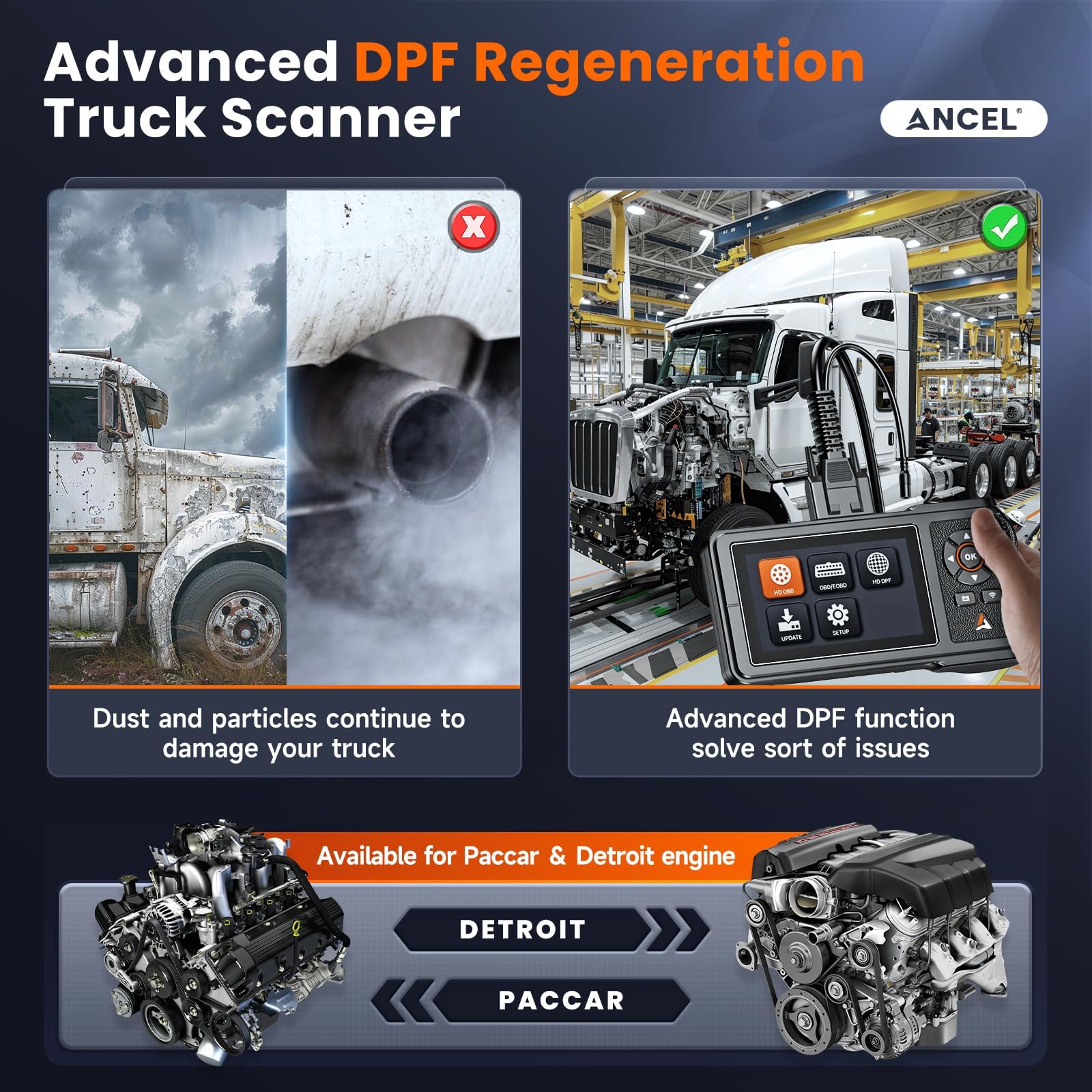 DPF Regen for Detroit & Paccar: HD431 truck scanner supports forced regeneration, replacement, and reset functions for Detroit and Paccar truck engines. For truck owners, it is necessary to perform DPF regeneration regularly. This will help extend the service life and reduce maintenance costs of your truck, avoiding the hundreds of dollars and several hours required for a forced regeneration in the case of an emergency shutdown. Don't waste your valuable time on the road due to DPF problems