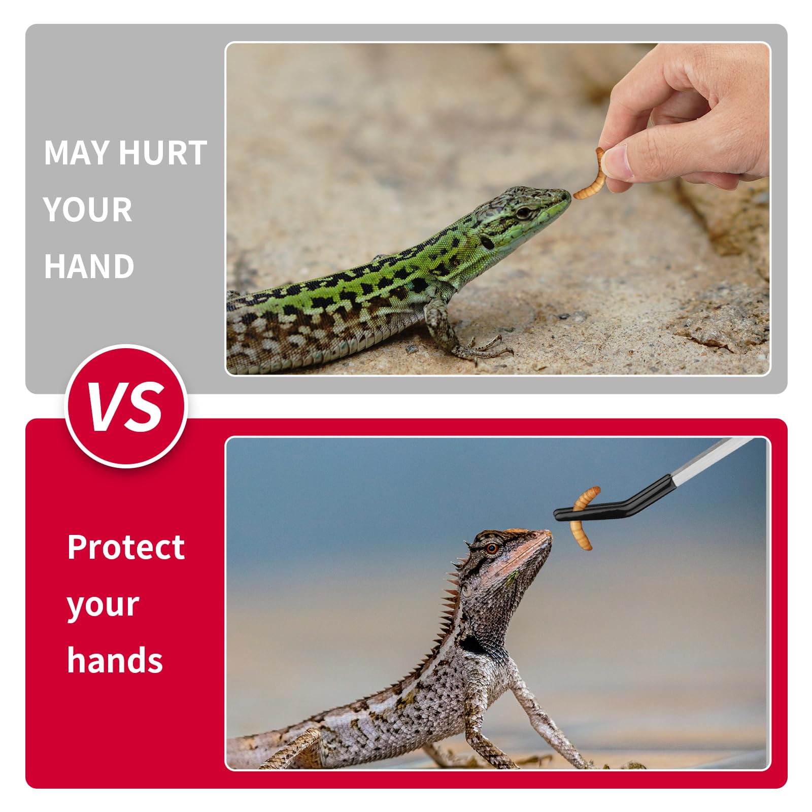 Precision Control and Grip - Both reptile feeding tongs are ergonomically designed to offer an comfortable grip, allowing for prolonged use without fatigue. And it ensures precise control, making it easy to handle small objects like worms,crickets, stones with accuracy. Whether you're feeding your reptiles or managing delicate tasks, the enhanced grip reduces the risk of slips.