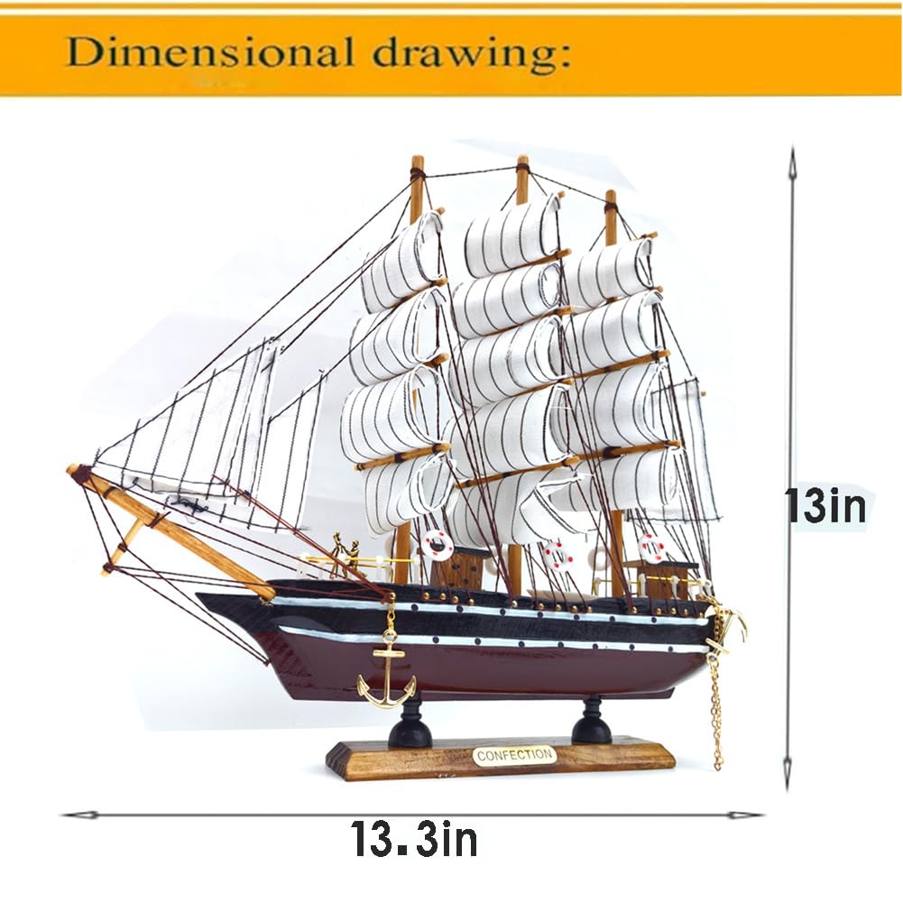 model shipsMaterial: Anti corrosion solid wood, canvas, main hull and mast are all made of wood, and canvas and metal accessories are sturdy and durable, which can create a marine atmosphere and match with various marine themed decorations. The handheld size is approximately 13.3 * 13 inches (length x height)