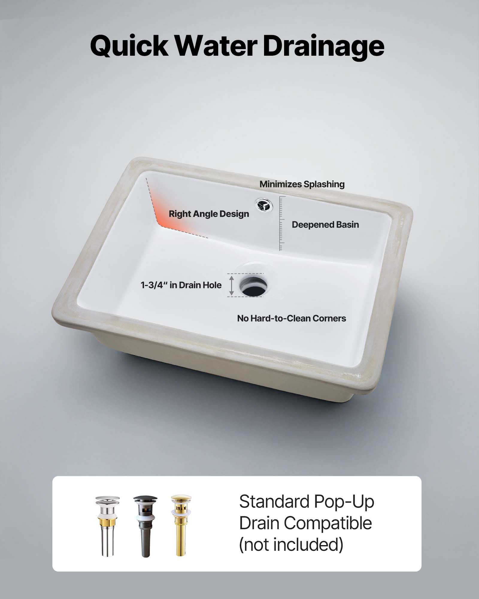 Quick Drainage: Equipped with a rectangular basin and a wide drain hole, this bathroom undermount sink fits most standard pop-up drains. It ensures fast water flow without buildup, and the built-in overflow hole avoids leakage