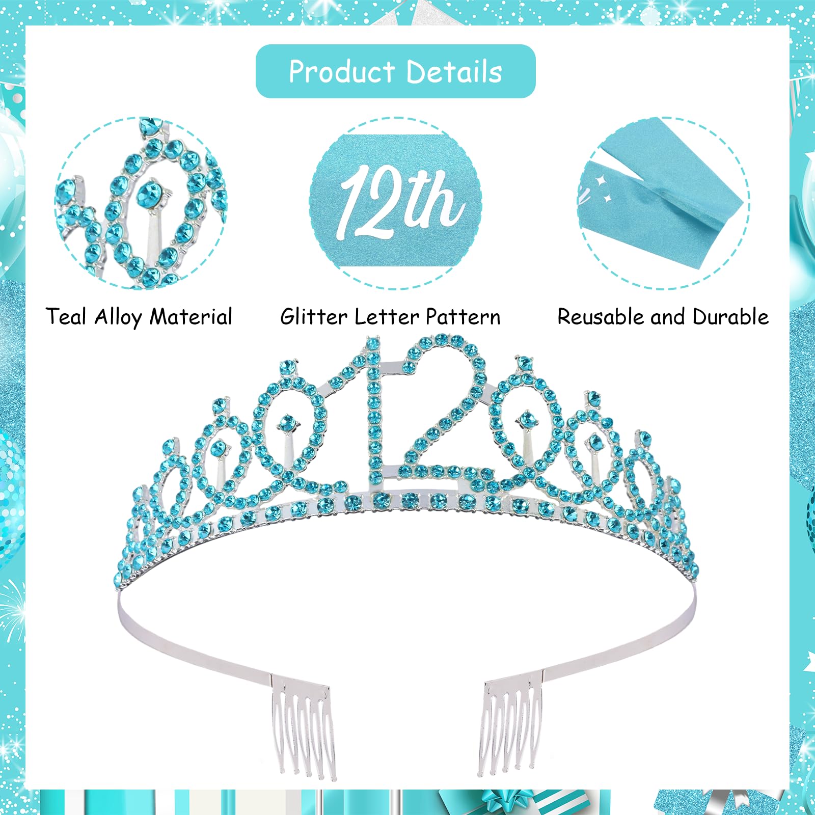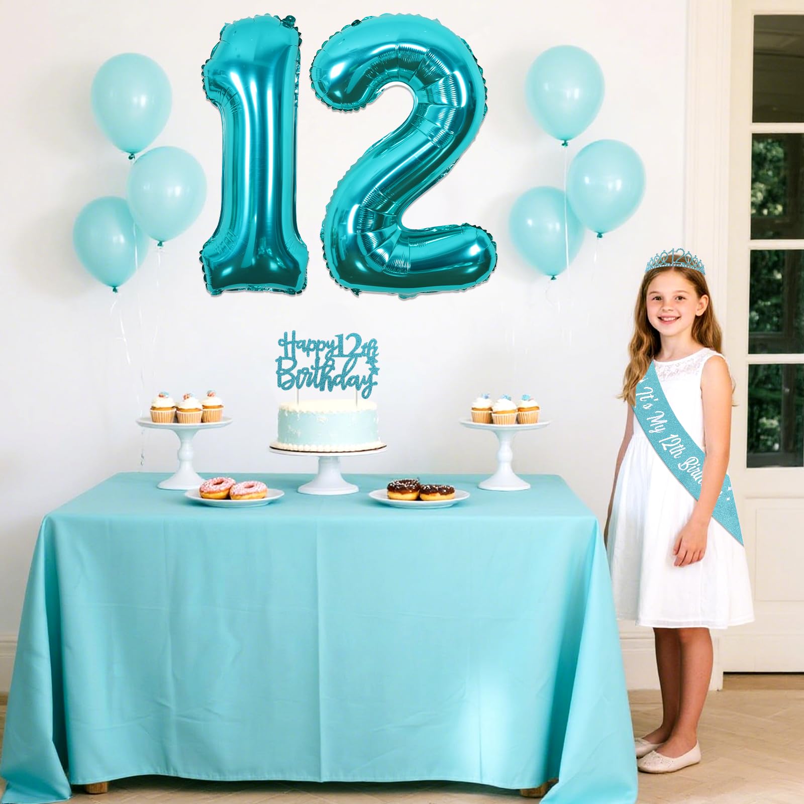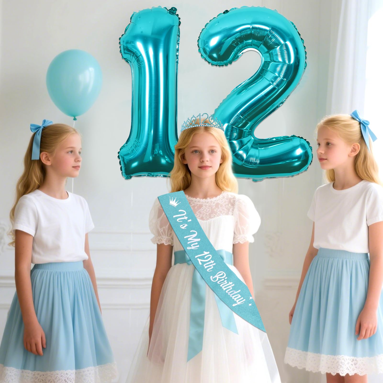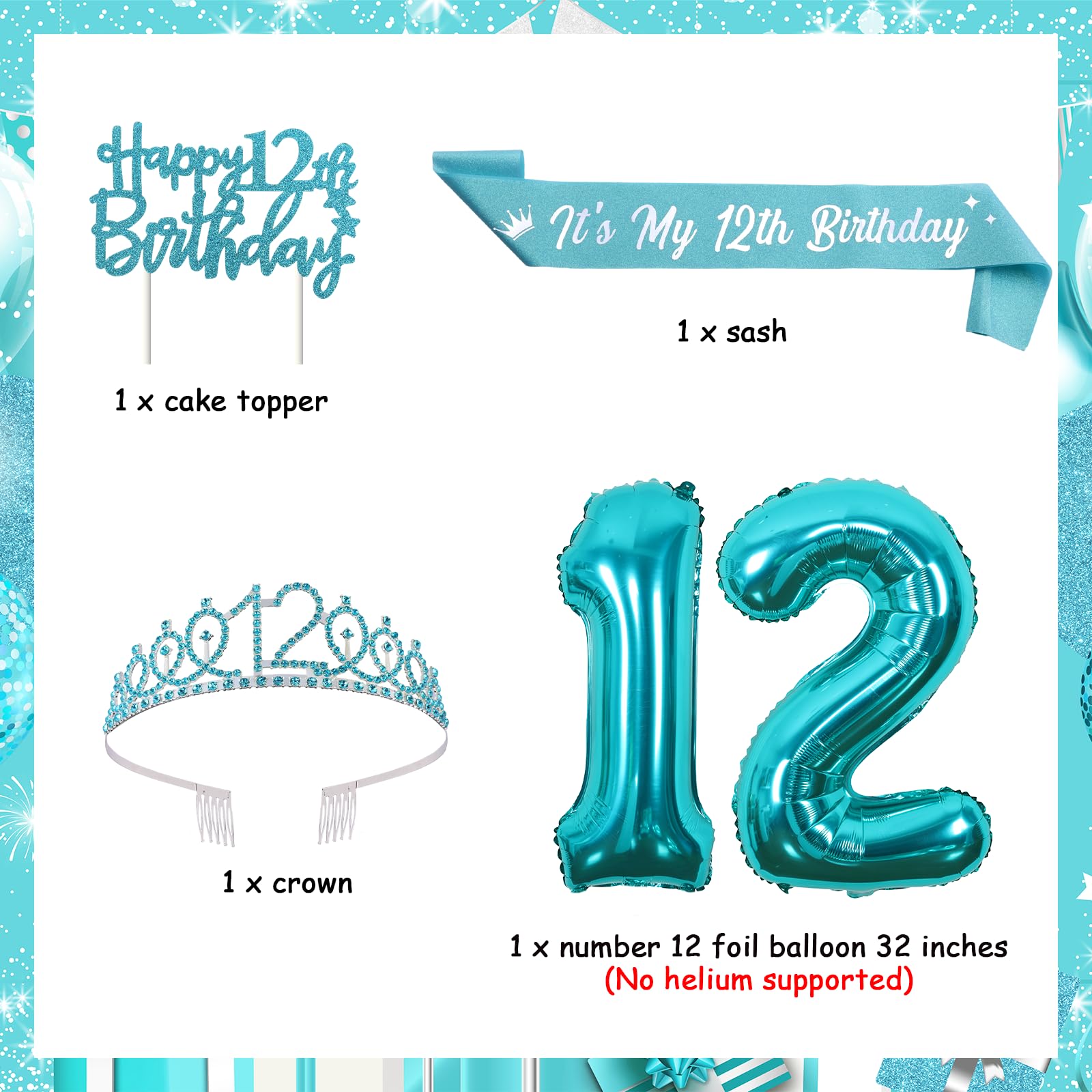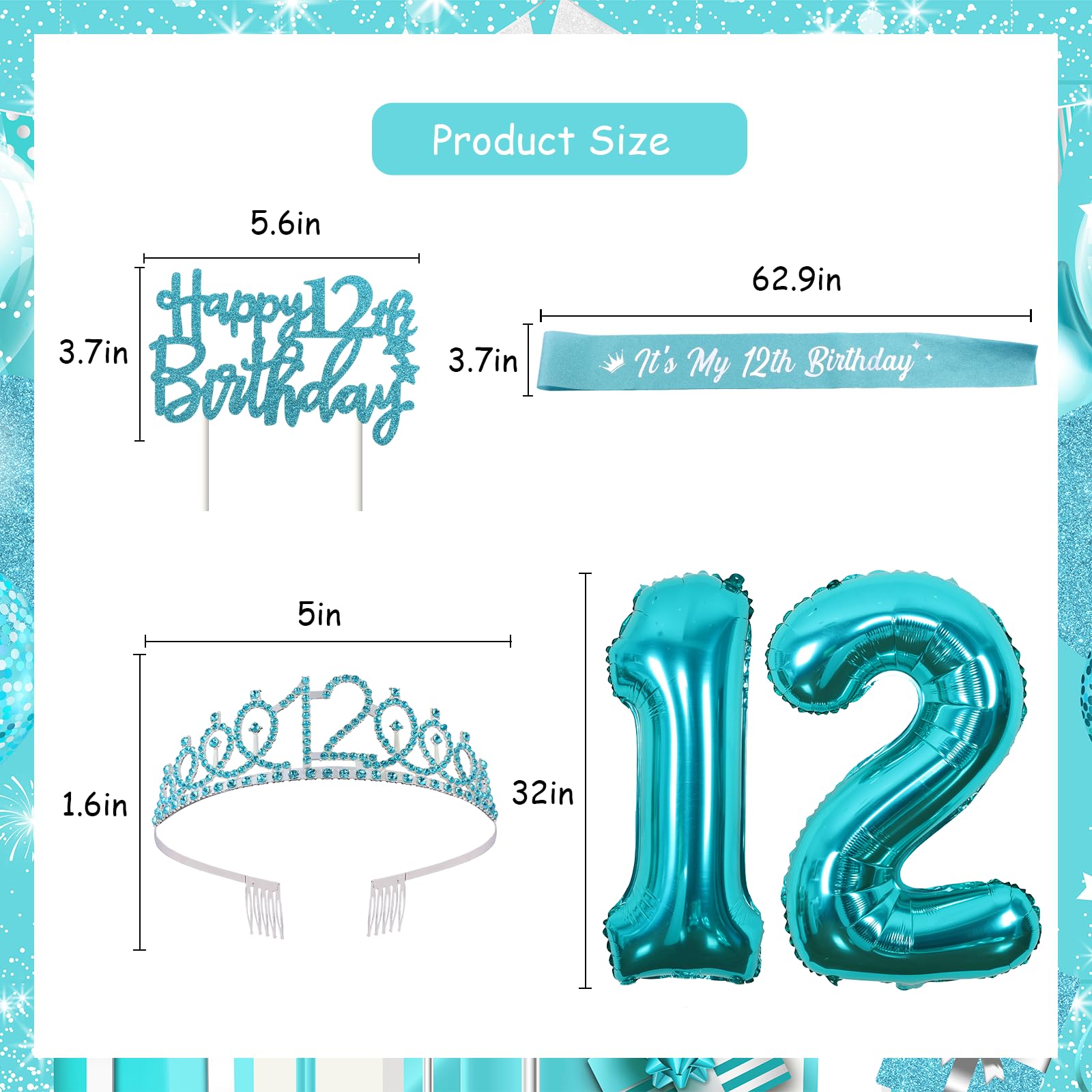 Teal 12th Birthday decorations for Girls: You will receive 1 12th birthday crown, 1 it’s my 12th birthday sash, 1 happy 12th birthday cake topper, 1 number 12 foil balloon 32 inches, 2 ribbons.