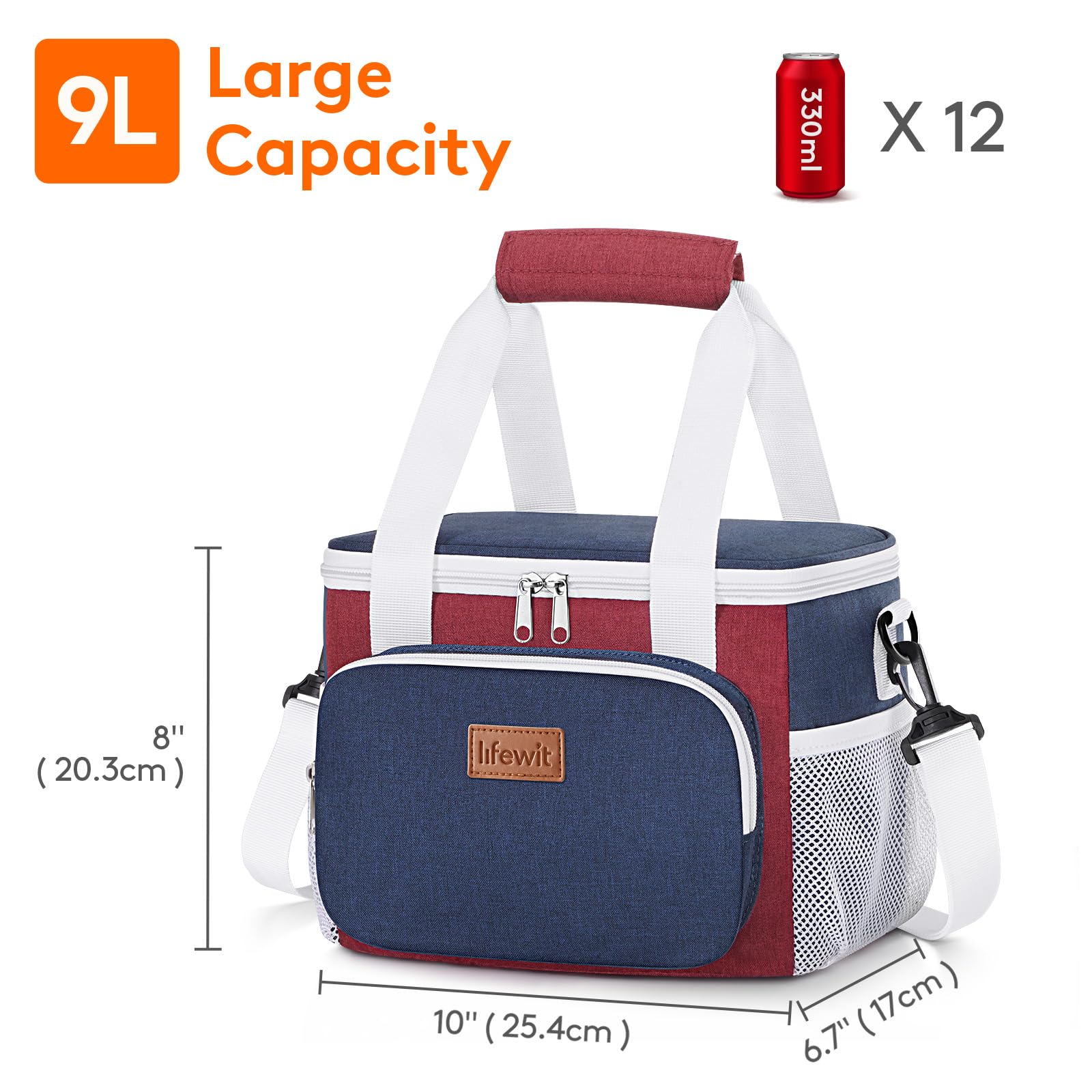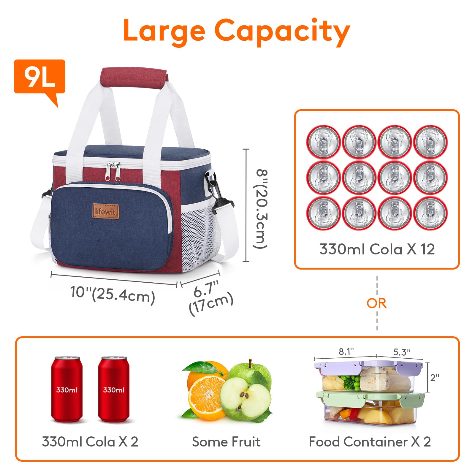 Large Capacity: Dimensions - 10" ( 25.4cm ) × 6.7" ( 17cm ) × 8" ( 20.3cm ). The maximum capacity of lunchbox for adults is 9L, and is spacious enough to store 12 cans of coke (330ml), or your lunch such as sandwiches, salad, snacks, drinks and fruits and so on. It is suitable for office, for work, picnic, beach, trip