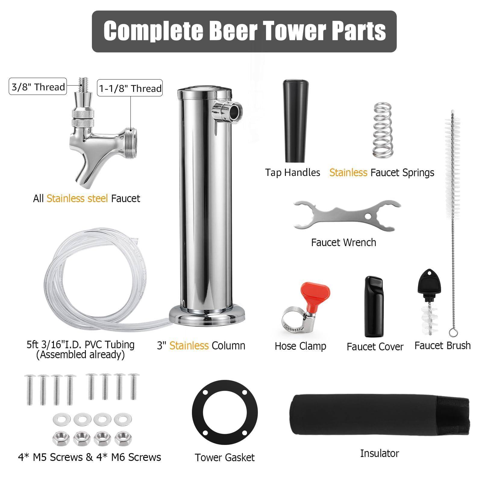 Complete Kegerator Replacement Parts Kit: This single faucet beer tower kit comes with everything you need for installation, including a 3” Stainless Column, 5ft beer line, stainless beer faucet, tap handle, faucet spring, M5 Screws and nuts, M6 Screws and nuts, insulator foam, gasket, faucet wrench, faucet covers and brushes
