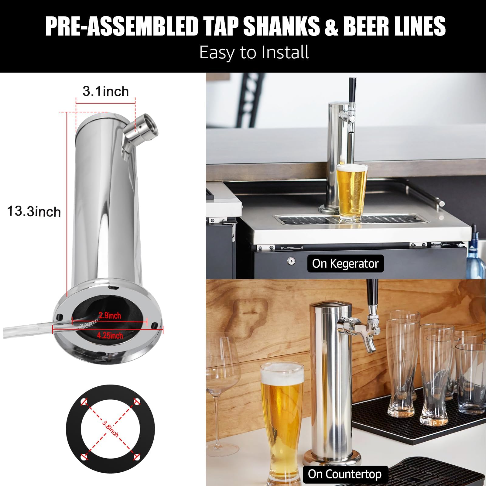 Pre-installed Beer Line for Easy Installation: 5 ft 3/16"ID beer line tubing and beer faucet shank are pre-installed in the beer tap tower to save you time. It only a few minutes to install this keg tower into the kegerator or countertop. The attached beer faucet wrench can be used to tighten the beer faucets and beer shanks during installation, ensuring tight connections and leak-free. It also is very easy to disassemble kegerator tap for deep cleaning with the tap wrench