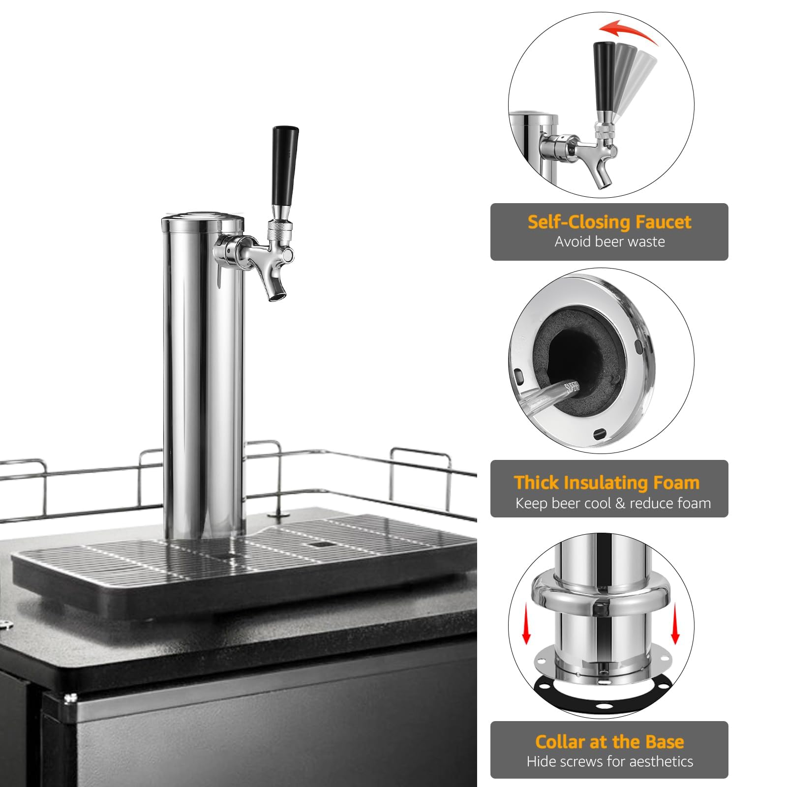 Upgraded Self-closing Beer Tap Faucet: Our kegerator tower kit features a stainless steel spring placed between the beer faucet and faucet shank. This spring enables the beer faucet to automatically close after use, preventing accidental spills and beer wastage. Enjoy a mess-free and efficient draft beer experience with this innovative feature. Elevate your draft beer pouring experience with our beer tap tower