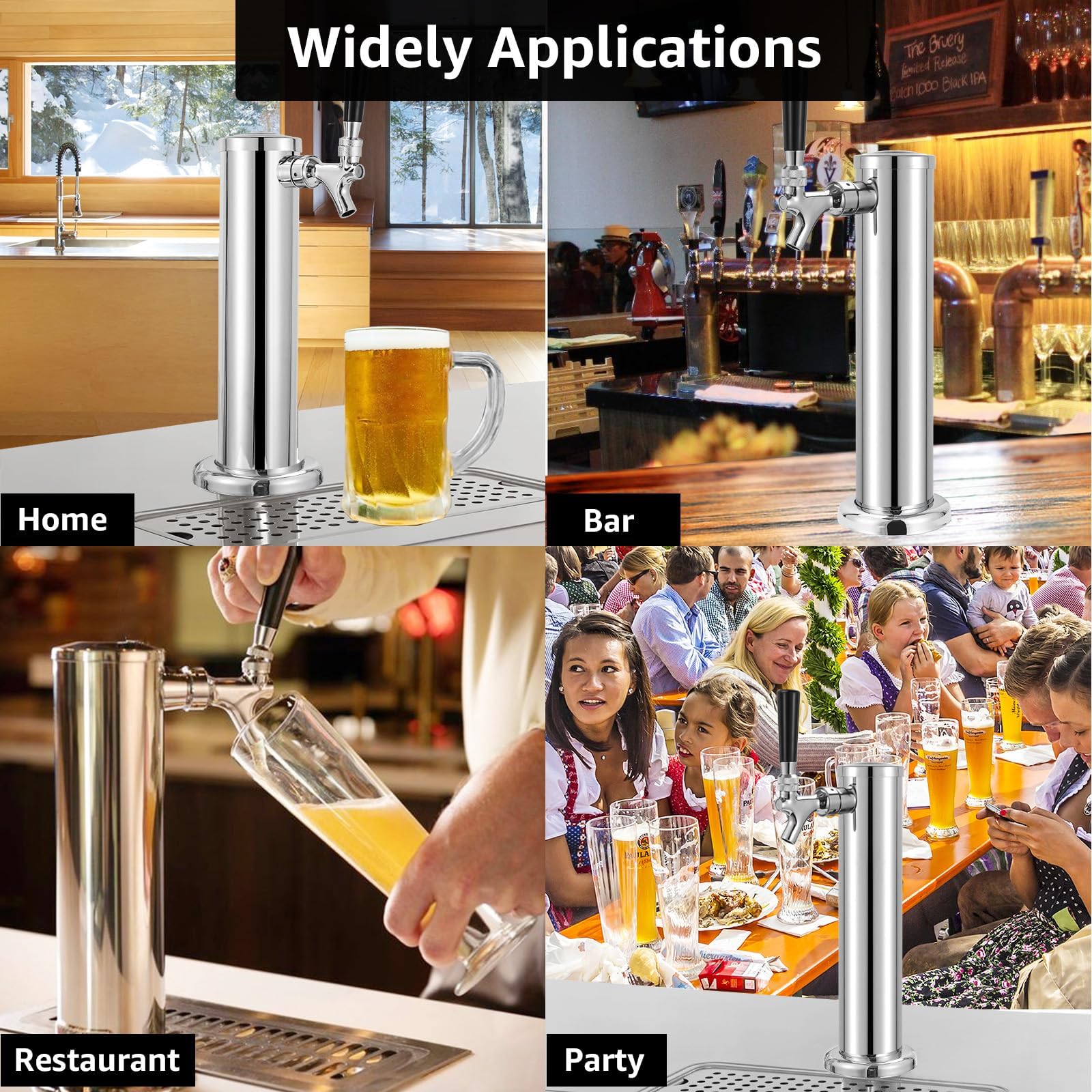 All Stainless Steel Beer Tower: Crafted with high-grade 304 stainless steel, our kegerator beer tower offers unparalleled durability, resistance to wear, and corrosion protection. Compared to the brass beer faucet, our all stainless steel kegerator tower ensures a cleaner and healthier pouring experience. The beer tap tower’s high-quality material, solid construction, and stylish design secure years of reliable service