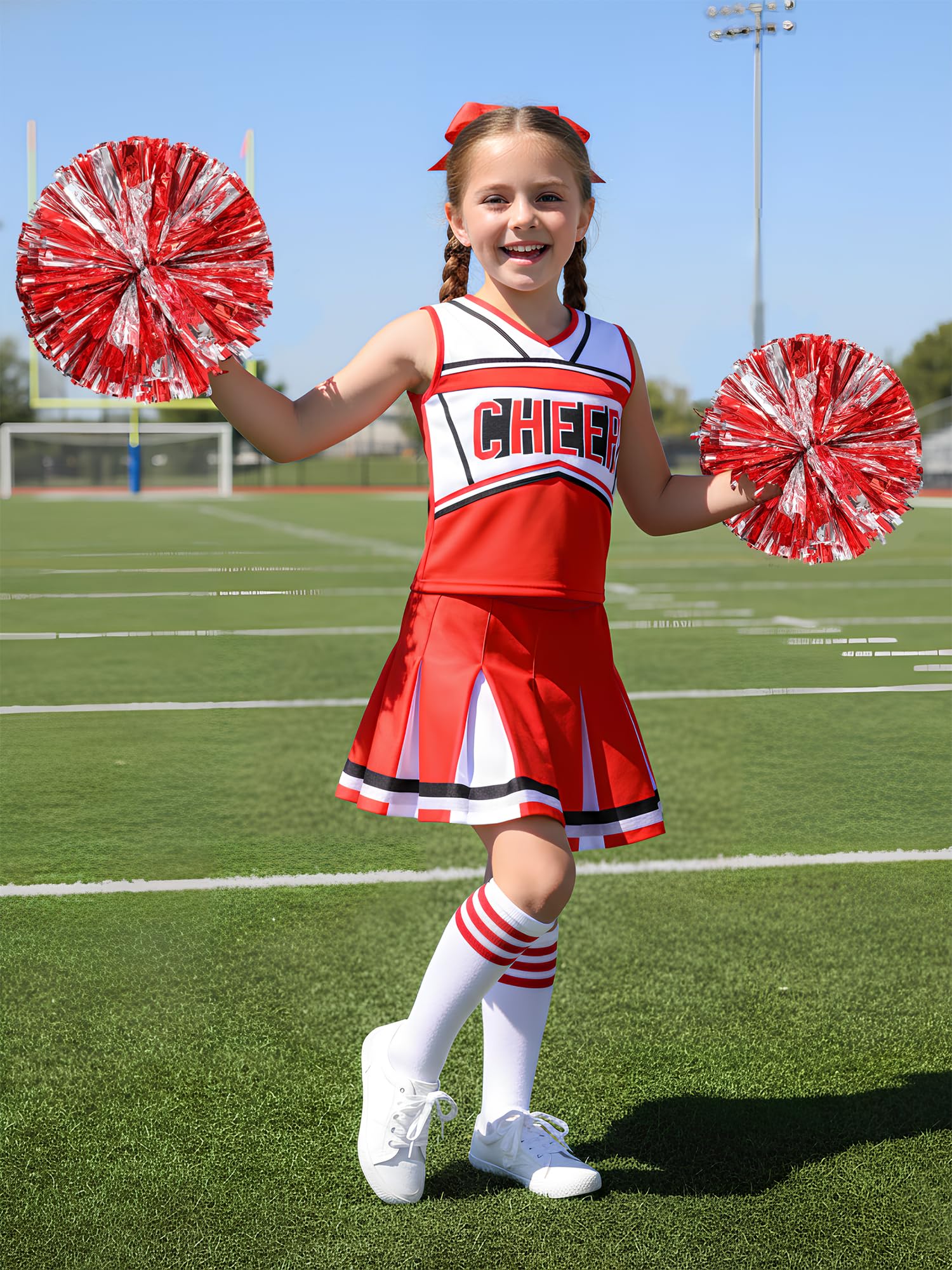 Complete Cheerleader Ensemble Set:Includes all essential items: "CHEER" lettered top, matching skirt, pom poms, hair bow, and knee-high socks for instant team-ready appearance.
