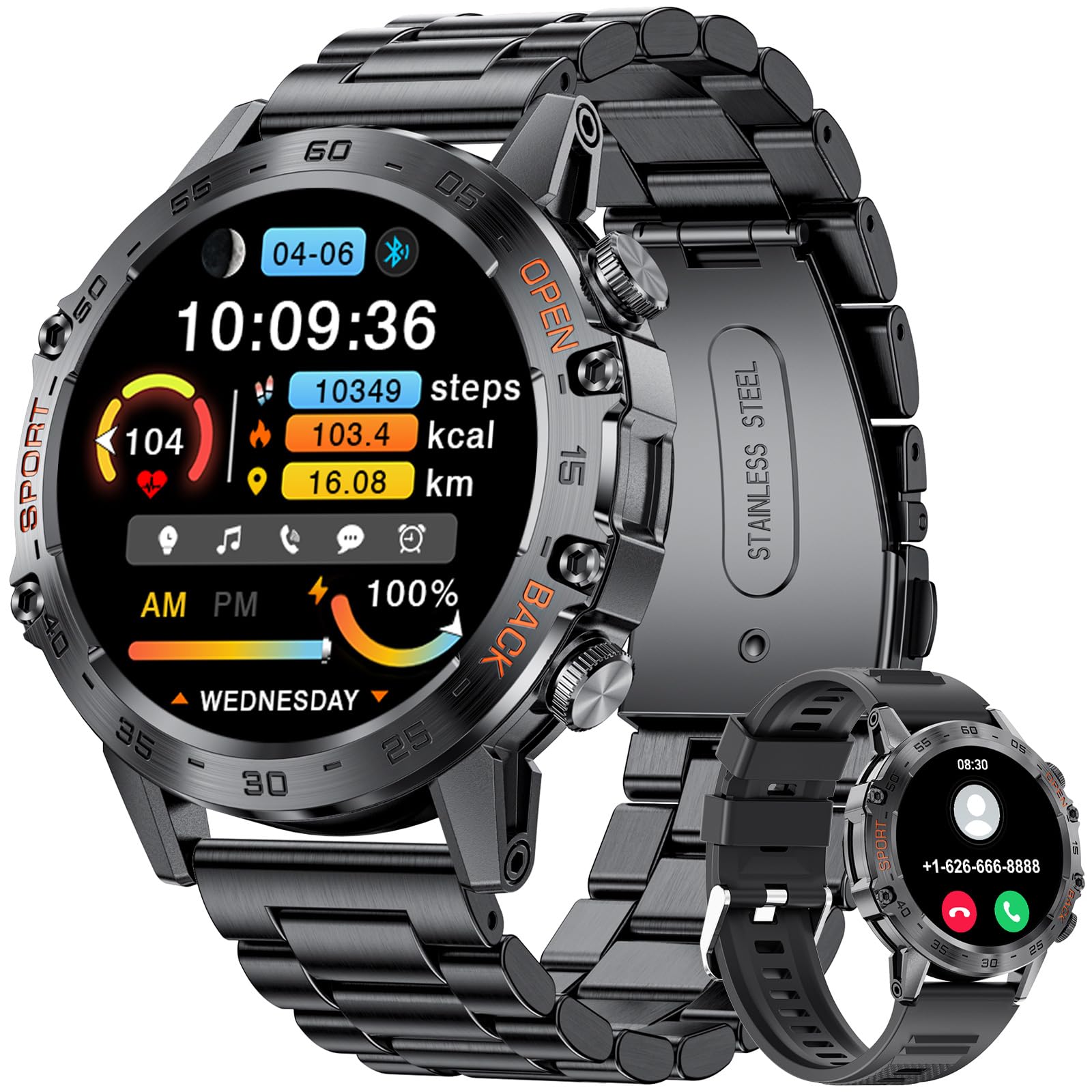 【Multifunctional Smart Watch for Men】Bluetooth voice call rugged smart watches features include social media message notifications and previews,AI voice assistant,blood pressure,blood oxygen,dynamic heart rate,sleep monitoring,alarm clock,calculator, breathing exercises, calorie counting,usiness cards,sedentary reminder,stopwatch,flip wrist light-up,remote camera,music control,weather forecast,multi dial switching,drinkwater reminder,100+ sports modes
