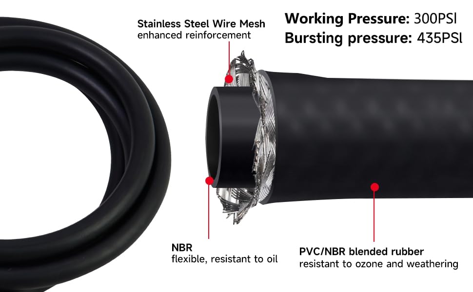 High-Pressure & Temperature Resistance With a working pressure of 300 PSI (2.0 MPa) and a bursting pressure of 600 PSI (4 MPa), this hose is designed to handle demanding fuel transfer tasks. It also operates effectively within a temperature range of -86℉ (-30℃) to +248℉ (+120℃), ensuring reliability in both hot and cold environments.