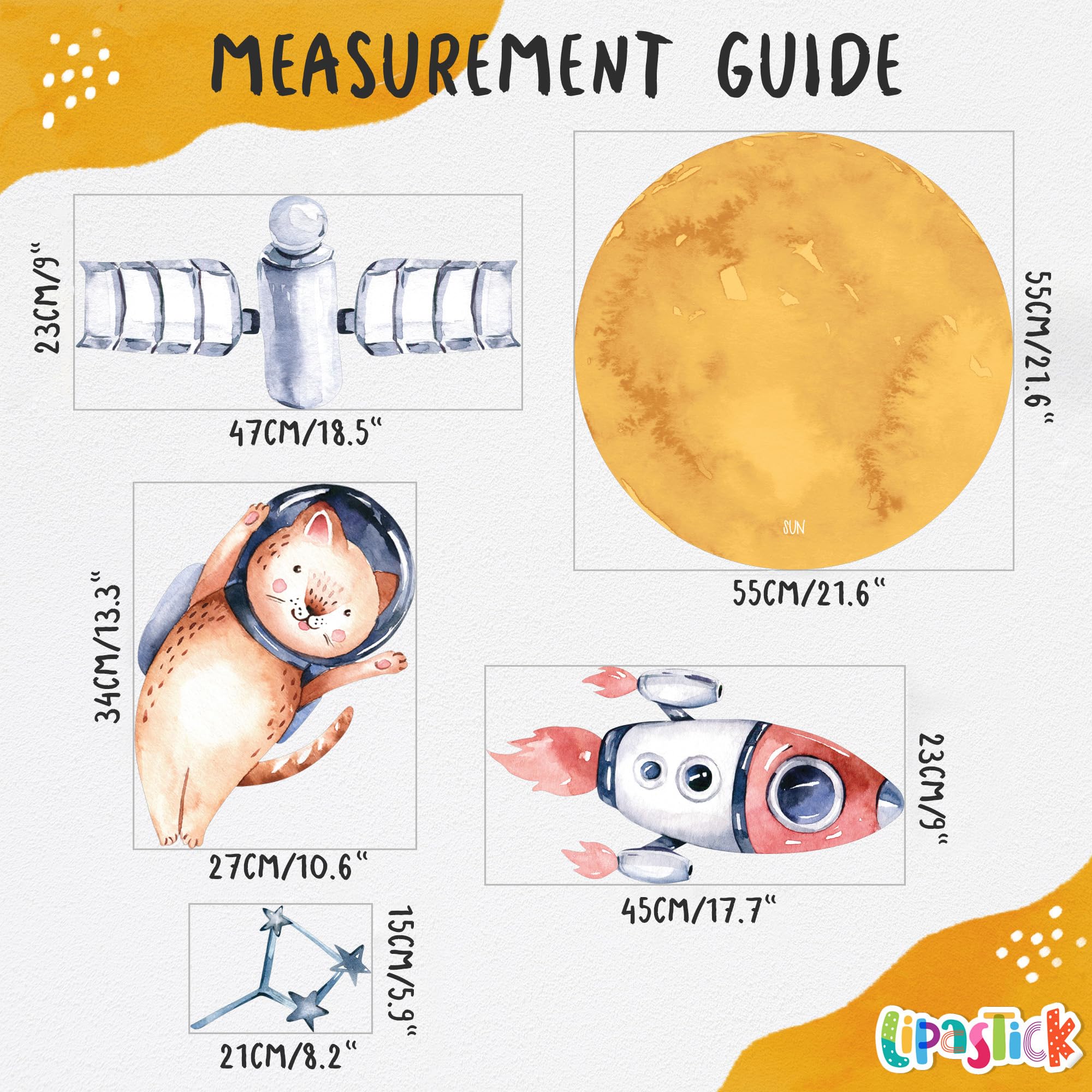 🌕 Space wall decal includes: sun, planets, satellite, spaceship, rockets, astronaut animals, asteroids, stars and constellations. Item sizes range from 2" x 2" to 21" x 21", for a total of 110 items. Solar system stickers come in a cardboard package in 4 sheets. Sheet size is 47.2" x 16.7". This set of wall stickers is size XXL and its size on the wall is 157" x 98"