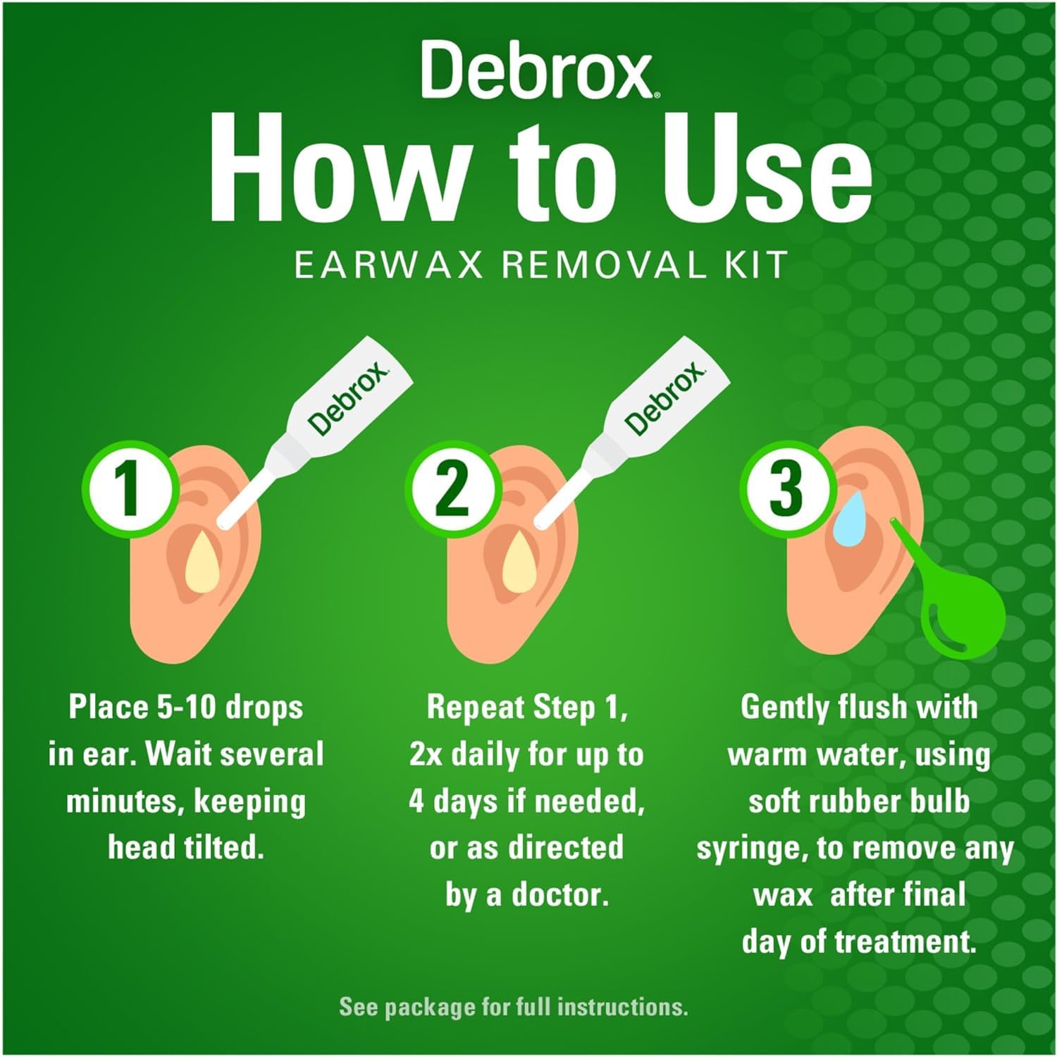 Contains 1 bottle of Debrox Ear Wax Removal Drops, 0.5 fl oz and a soft, rubber bulb syringe; squeeze 5-10 ear drops in each ear and flush with water using the bulb syringe