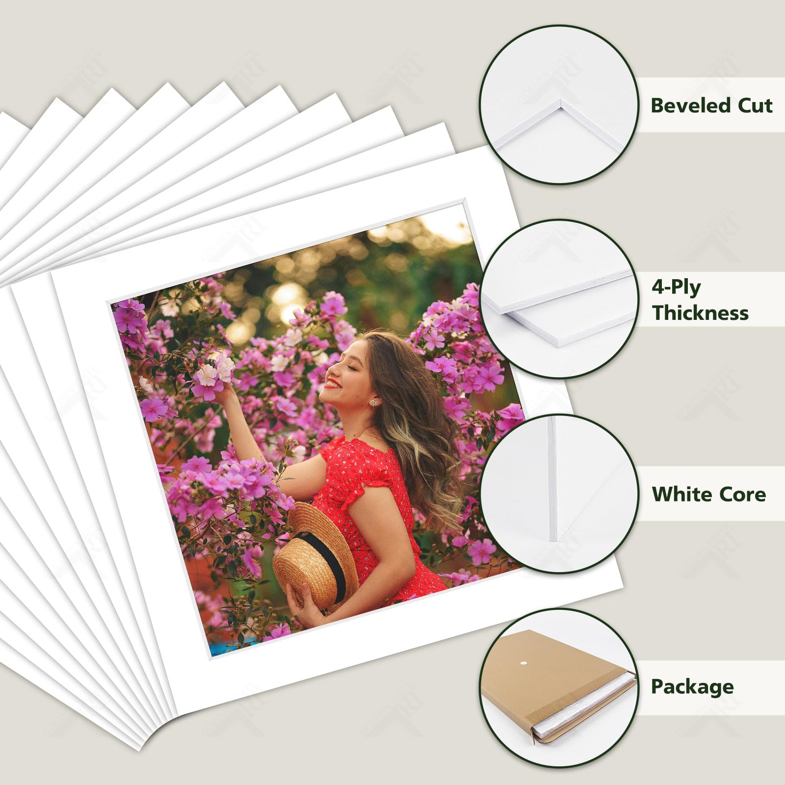 The mats are beveled cut with white core and 4-ply thick (about 1.4 mm or 1/16 inch)